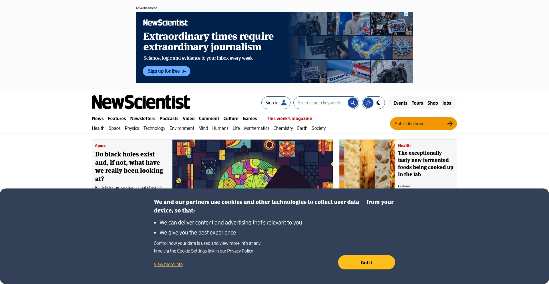 该网站实现符合GDPR或CCPA等隐私法规的cookie同意机制。这表明 newscientist.com 遵守数据保护标准并为用户提供对个人数据收集实践的控制。