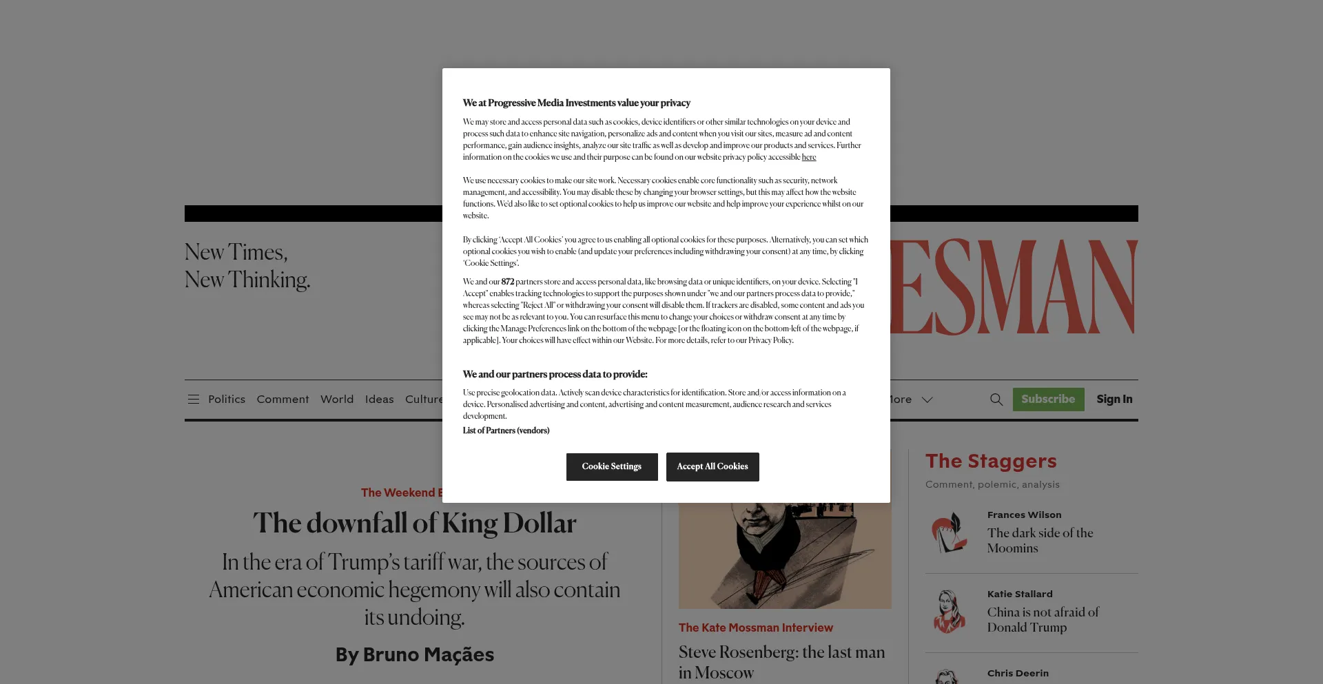 该网站实现符合GDPR或CCPA等隐私法规的cookie同意机制。这表明 newstatesman.com 遵守数据保护标准并为用户提供对个人数据收集实践的控制。