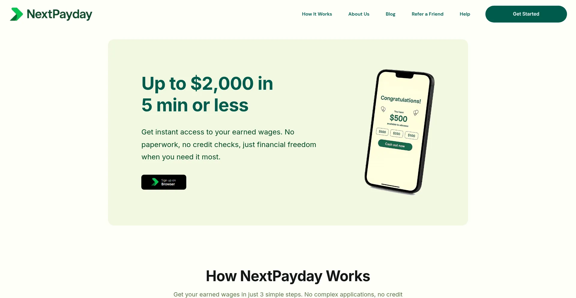 Wage advance app to get up to $2,000 fast. No credit checks, no paperwork—just secure, instant access to earned wages with NextPayday, 24/7.