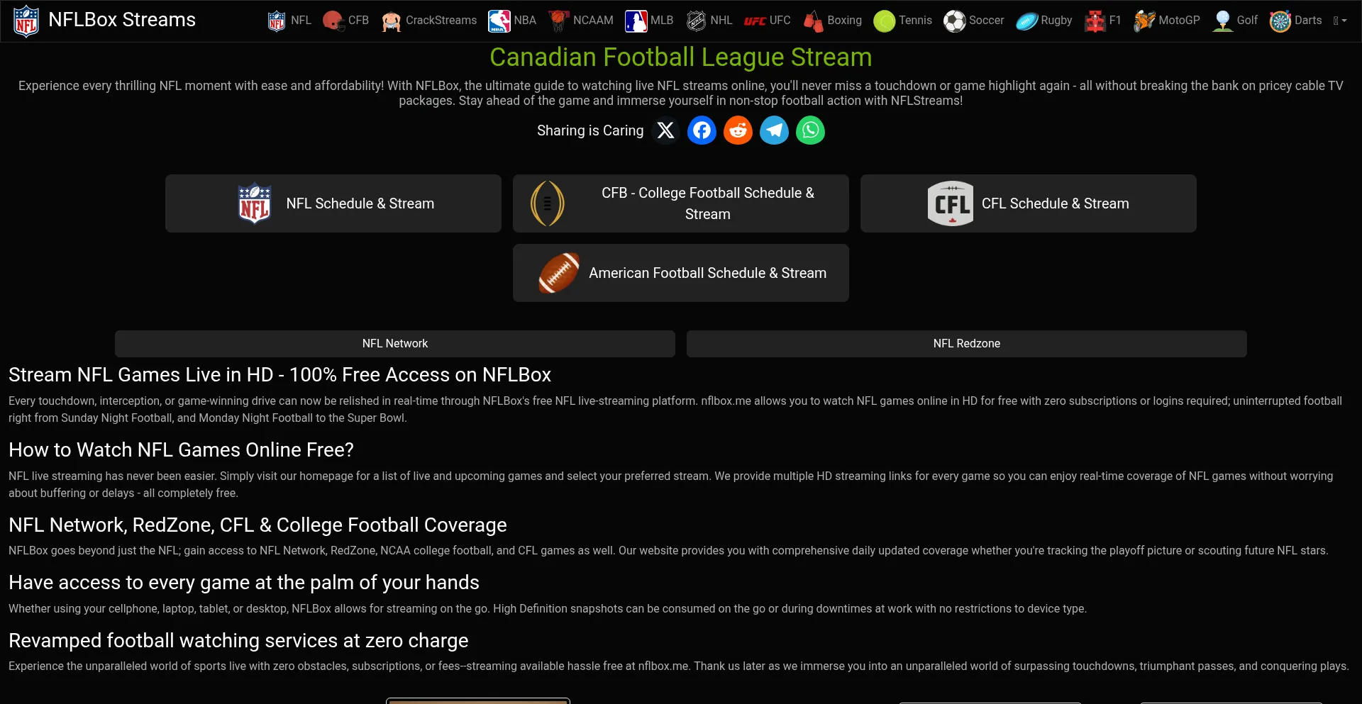 Watch all NFL games online free with NFL live streams on NFLBox. Enjoy NFL Network, RedZone, CFL, and NCAA college football streaming.