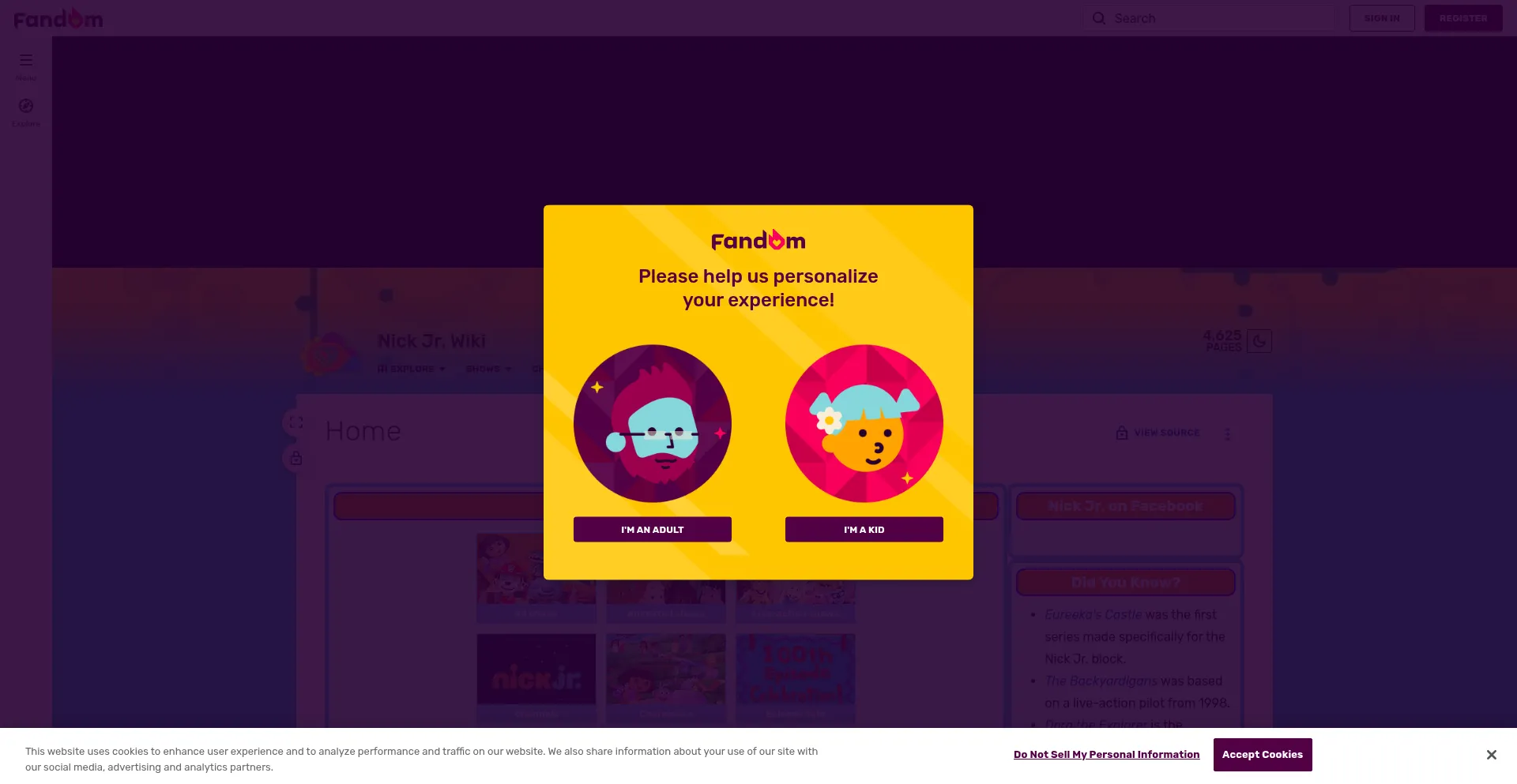 该网站实现符合GDPR或CCPA等隐私法规的cookie同意机制。这表明 nickjr.fandom.com 遵守数据保护标准并为用户提供对个人数据收集实践的控制。