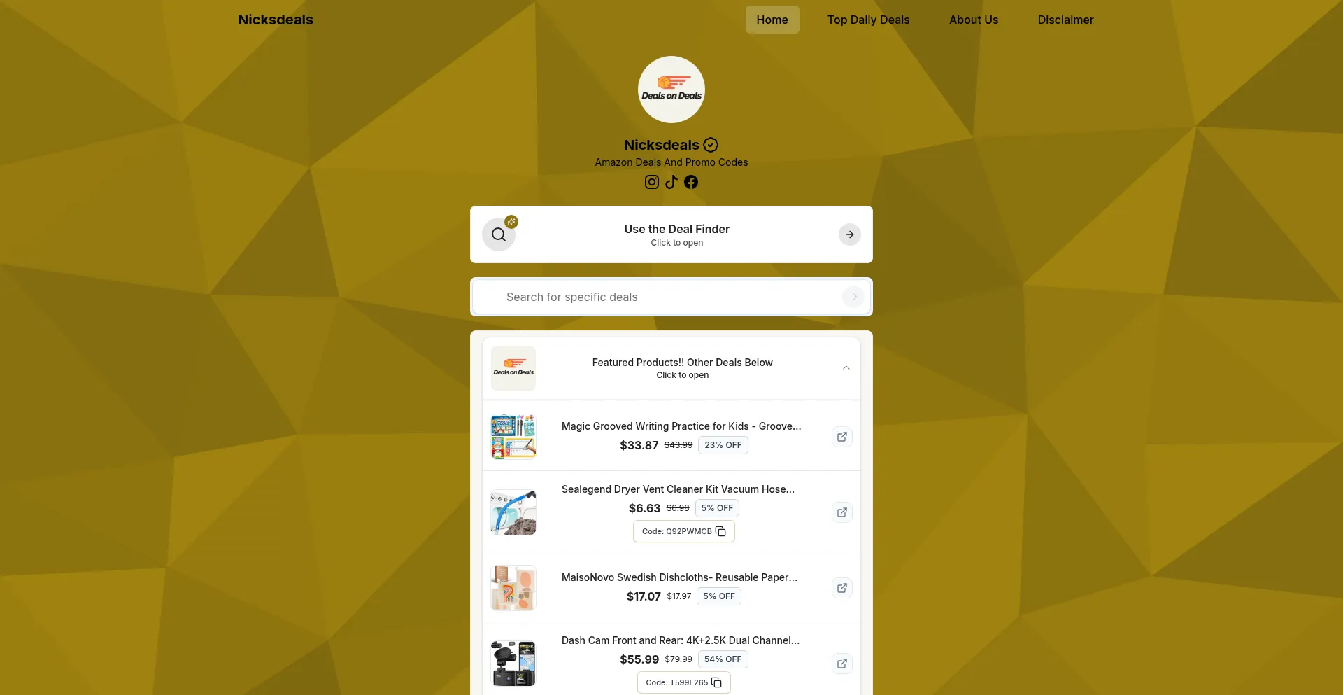 网站上存在社交媒体链接表明 nicksdeals.org 在社交媒体上维护官方账户,这是可信度和参与度的积极信号。