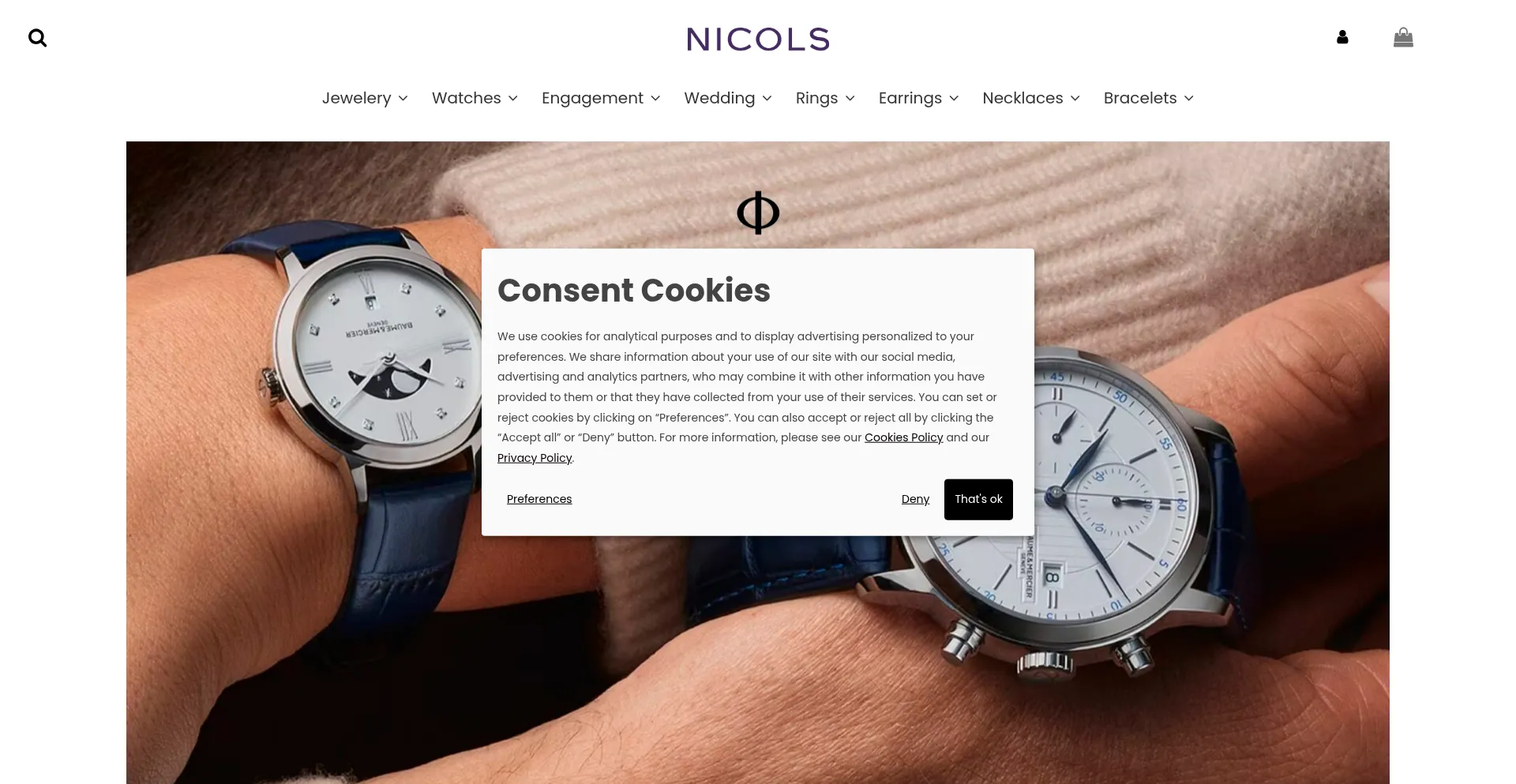 该网站实现符合GDPR或CCPA等隐私法规的cookie同意机制。这表明 nicolsjewelry.com 遵守数据保护标准并为用户提供对个人数据收集实践的控制。