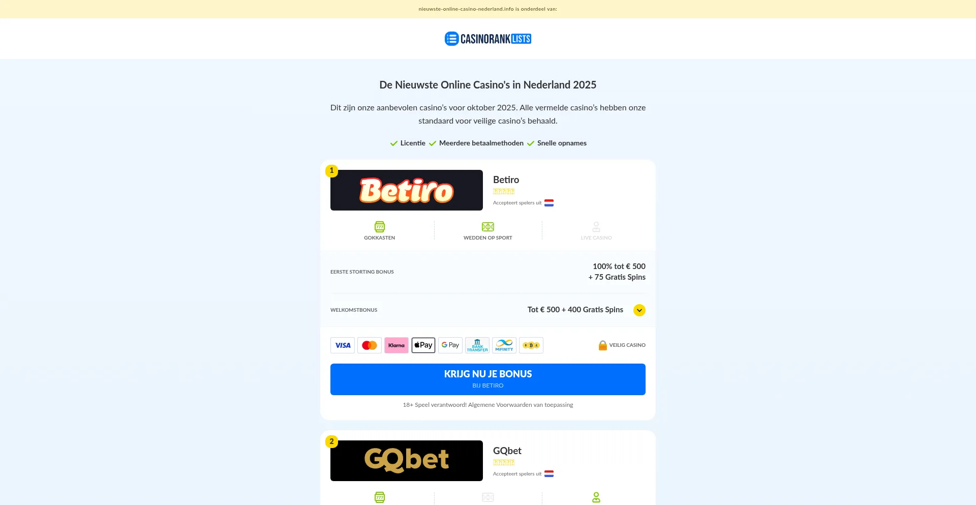 Dit zijn onze aanbevolen casino’s voor oktober 2025.