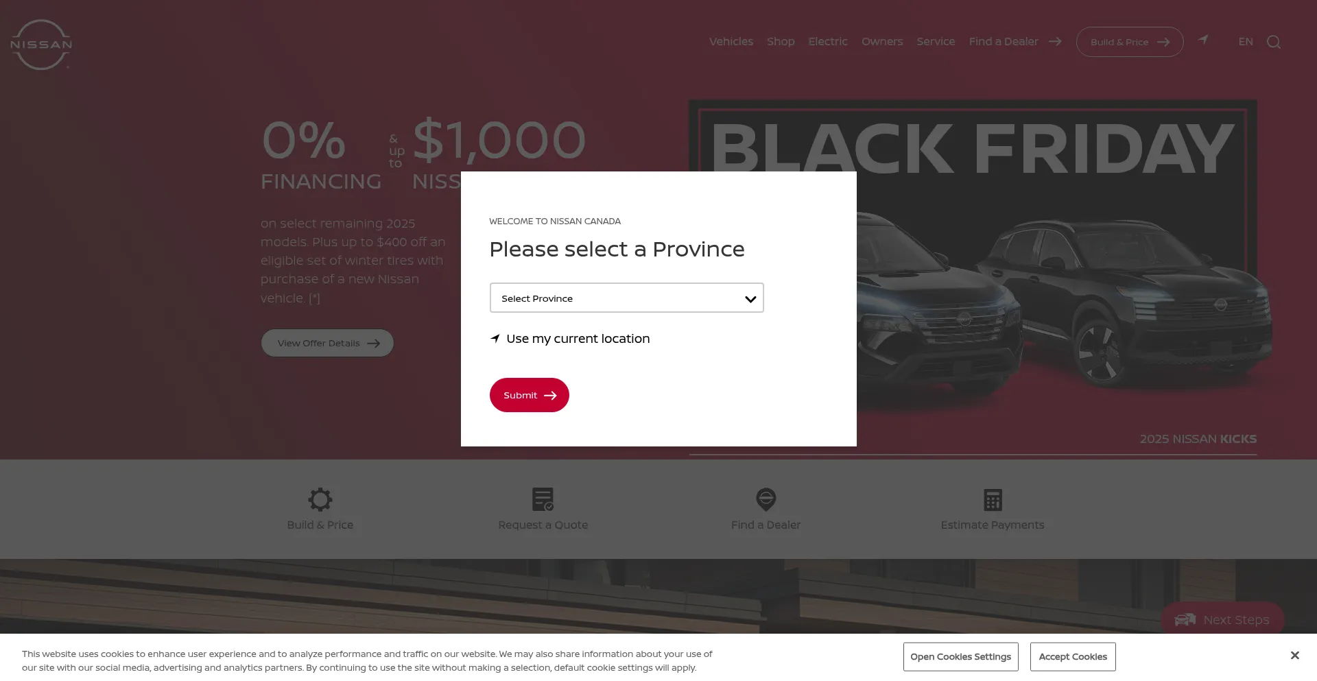 该网站实现符合GDPR或CCPA等隐私法规的cookie同意机制。这表明 nissan.ca 遵守数据保护标准并为用户提供对个人数据收集实践的控制。
