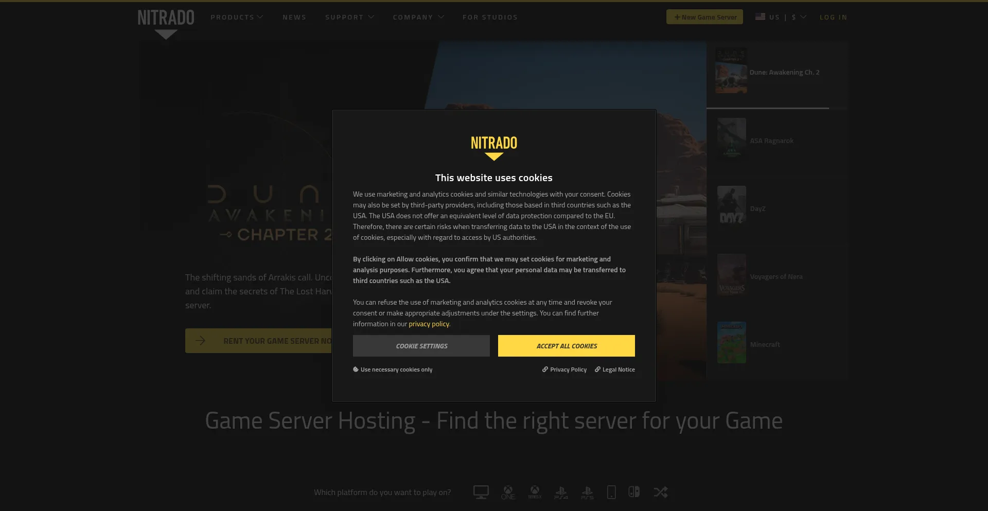 该网站实现符合GDPR或CCPA等隐私法规的cookie同意机制。这表明 nitrado.net 遵守数据保护标准并为用户提供对个人数据收集实践的控制。