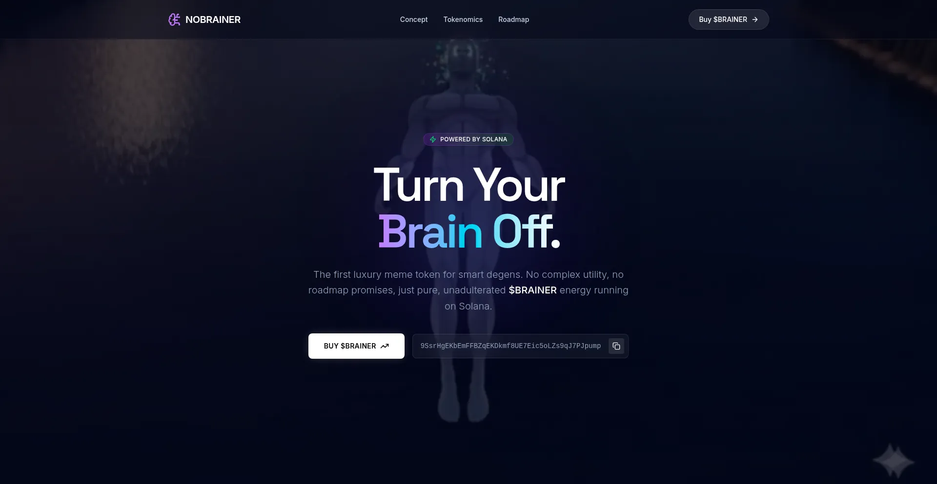 NoBrainer ($BRAINER) — the smartest degen play on Solana. Turn your brain off and ride the momentum.