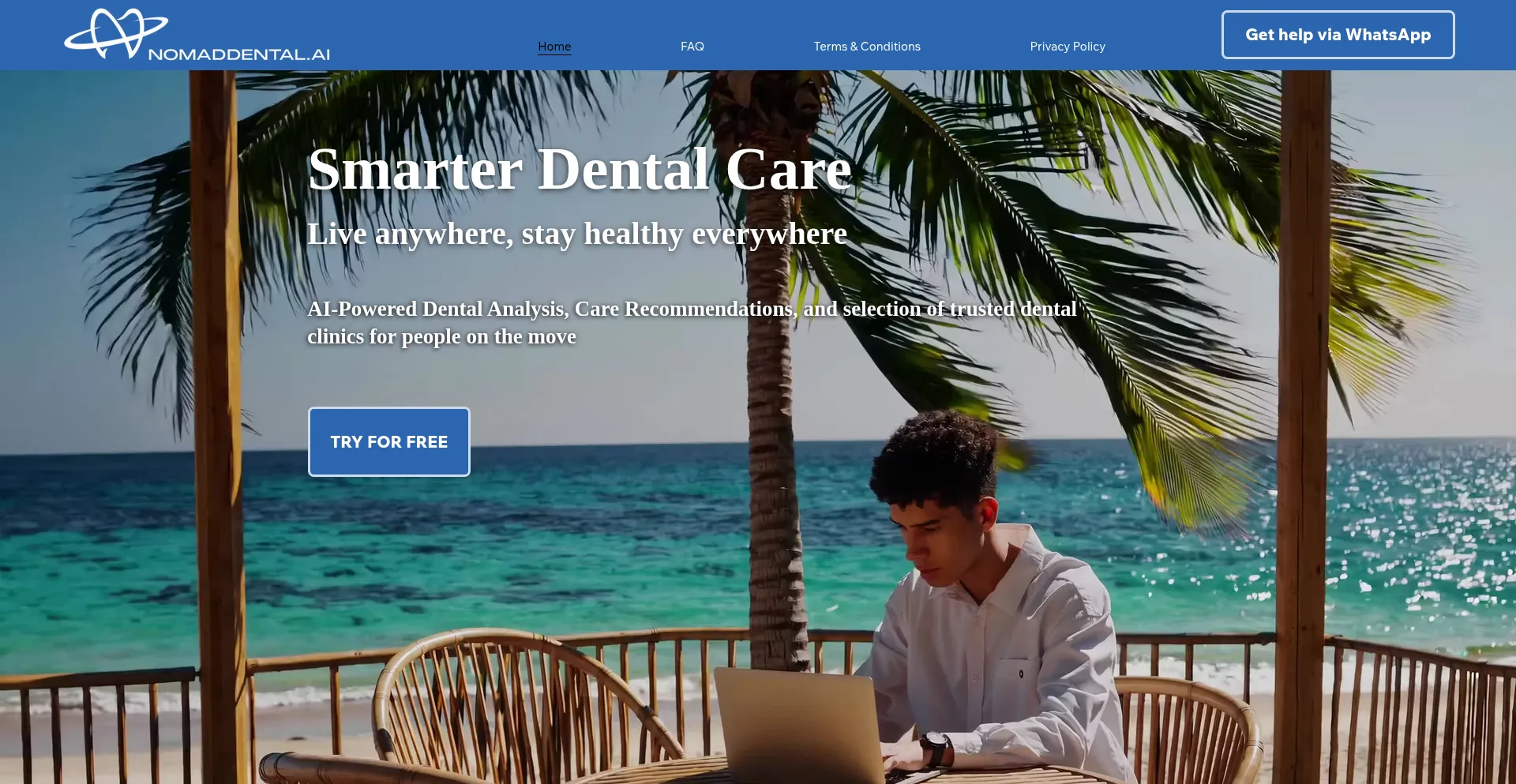 Nomaddental.ai lets digital nomads get instant AI-powered dental checkups using their smartphone. Receive oral health insights and book a local dentist anywhere in the world—n...