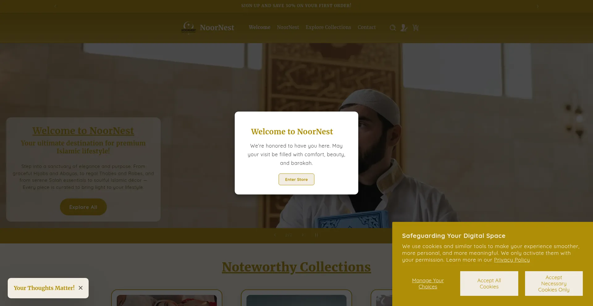 该网站实现符合GDPR或CCPA等隐私法规的cookie同意机制。这表明 noorneststore.com 遵守数据保护标准并为用户提供对个人数据收集实践的控制。
