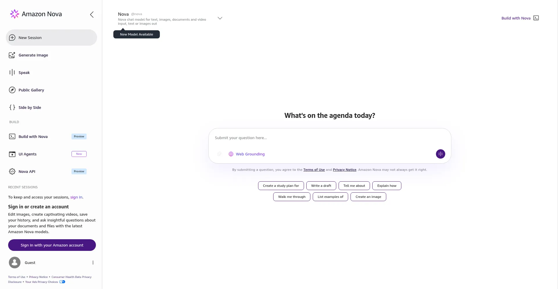 Try latest Amazon Nova foundation models, including Amazon Nova 2 Lite, Amazon Nova Act, and Amazon Nova 2 Sonic. Chat, create and edit images, generate text and code, and build...