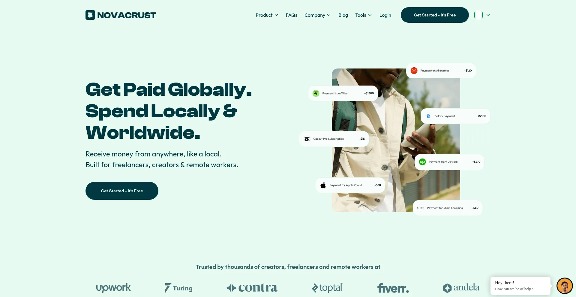 Open global accounts and cards with Novacrust. Get paid worldwide, spend locally, and manage money seamlessly as a freelancer or remote worker.
