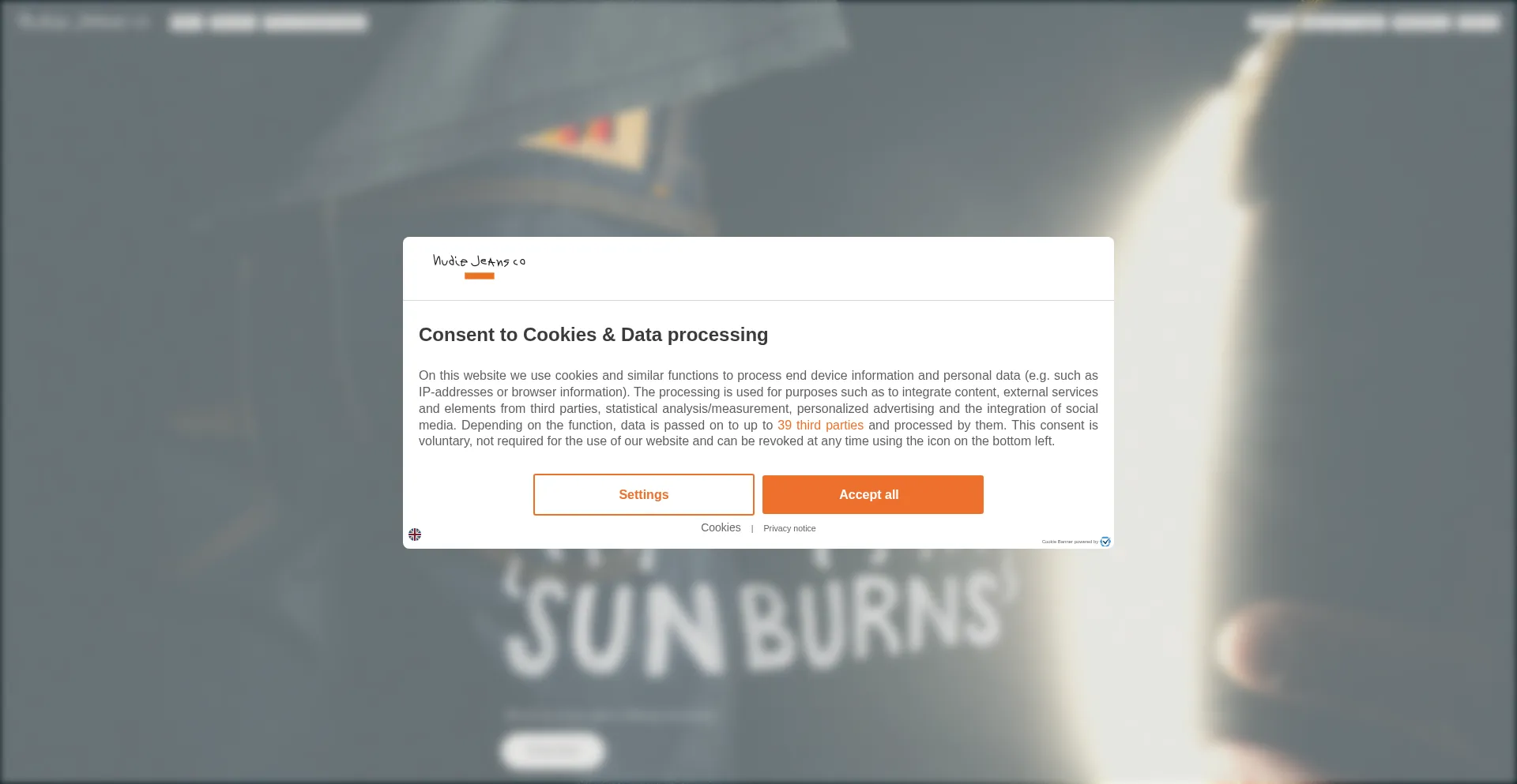 该网站实现符合GDPR或CCPA等隐私法规的cookie同意机制。这表明 nudiejeans.com 遵守数据保护标准并为用户提供对个人数据收集实践的控制。