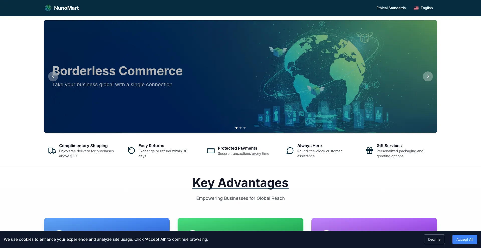 该网站实现符合GDPR或CCPA等隐私法规的cookie同意机制。这表明 nunomart.shop 遵守数据保护标准并为用户提供对个人数据收集实践的控制。