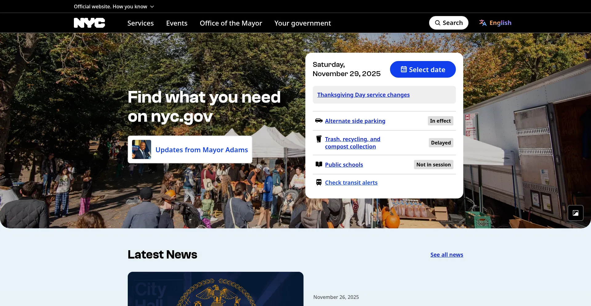 On the homepage of nyc.gov, you can check today's statuses for parking, schools, and trash collection. You can also access popular services, news, and see what's new from NYC go...