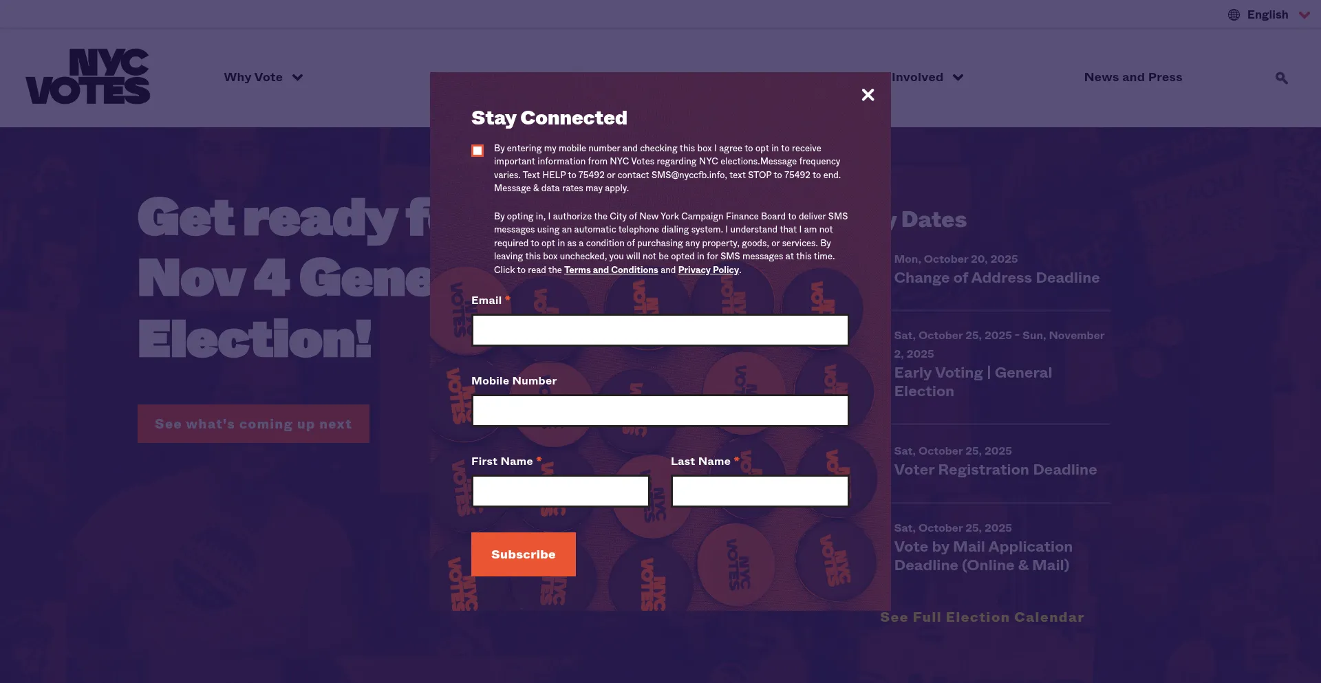 该网站实现数据收集表单,请求个人信息,包括姓名、电子邮件地址、电话号码或其他敏感详细信息。用户应验证 nycvotes.org 的合法性并在提交个人数据前查看隐私政策。
