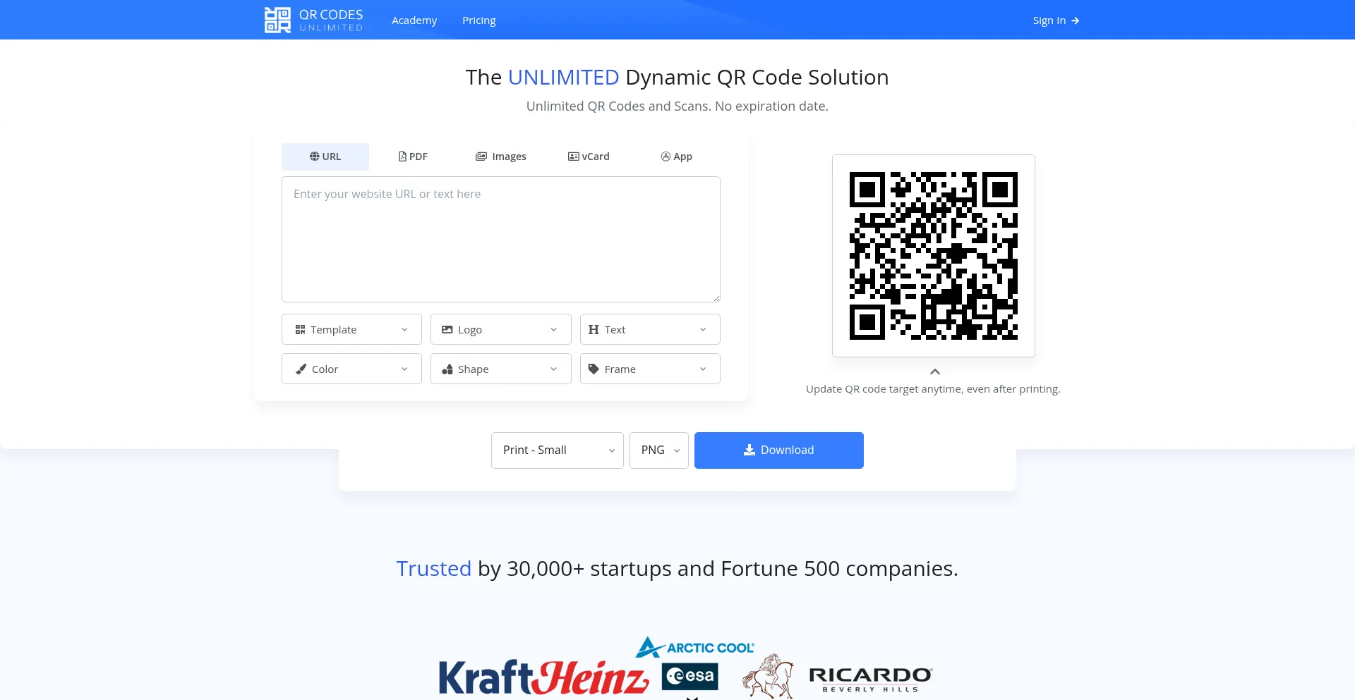 The complete Dynamic QR Codes solution. Generate QR Codes with your color, shape and logo. Trusted by major brands. Guaranteed to work forever.