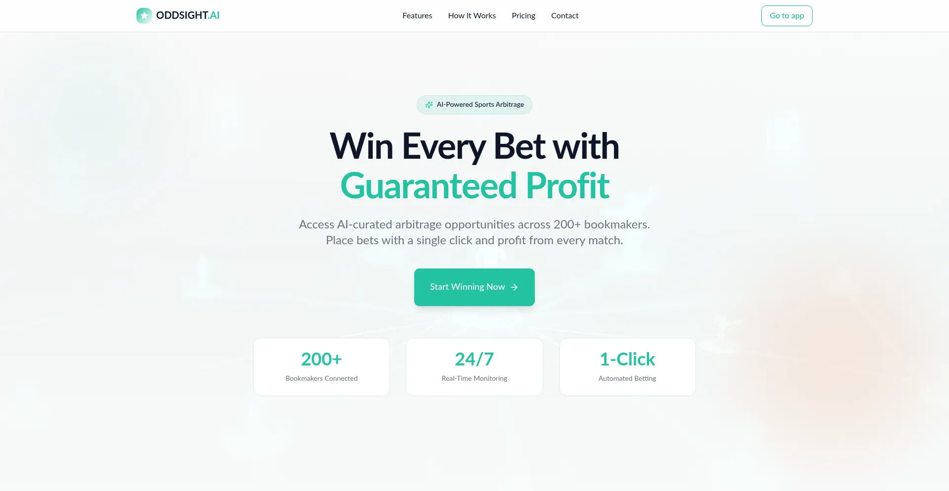 Win guaranteed profits from sports betting with Oddsight. AI-powered arbitrage opportunities across 200+ bookmakers. Place bets with a single click.
