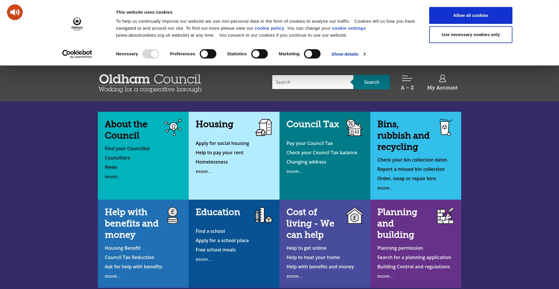该网站实现符合GDPR或CCPA等隐私法规的cookie同意机制。这表明 oldham.gov.uk 遵守数据保护标准并为用户提供对个人数据收集实践的控制。