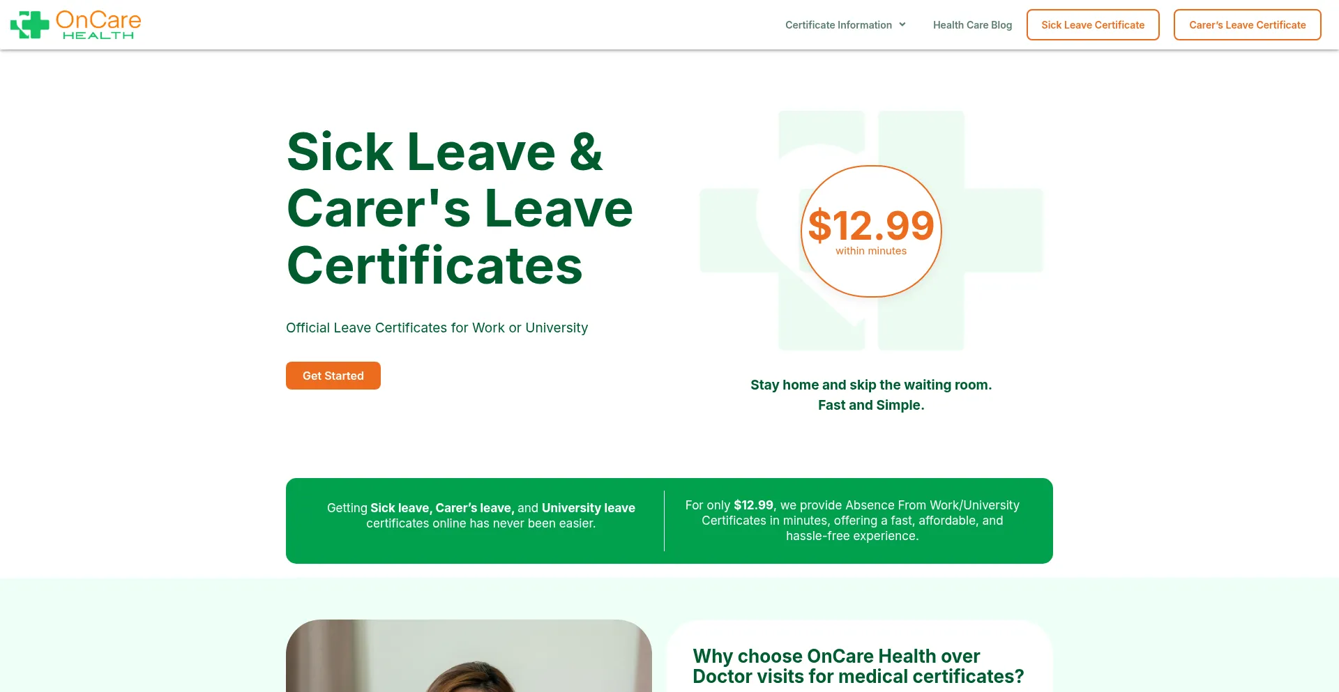 OnCare Health provides absence from work certificates for $12.99. No booking required. Receive it within minutes. Apply now.