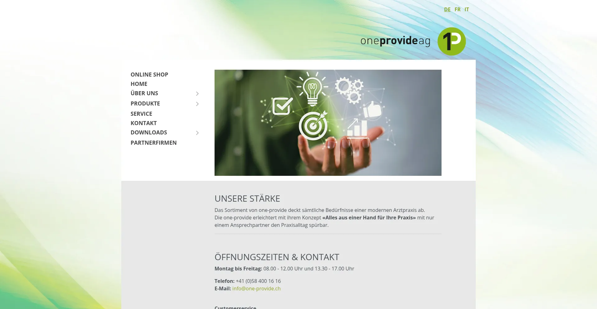 one-provide ag ist ein Schweizer Handelsunternehmen im Bereich medizinischer Analysegeräte und Verbrauchsmaterialien und ist ein Tochterunternehmen des Sonic Suisse Netzwerks.