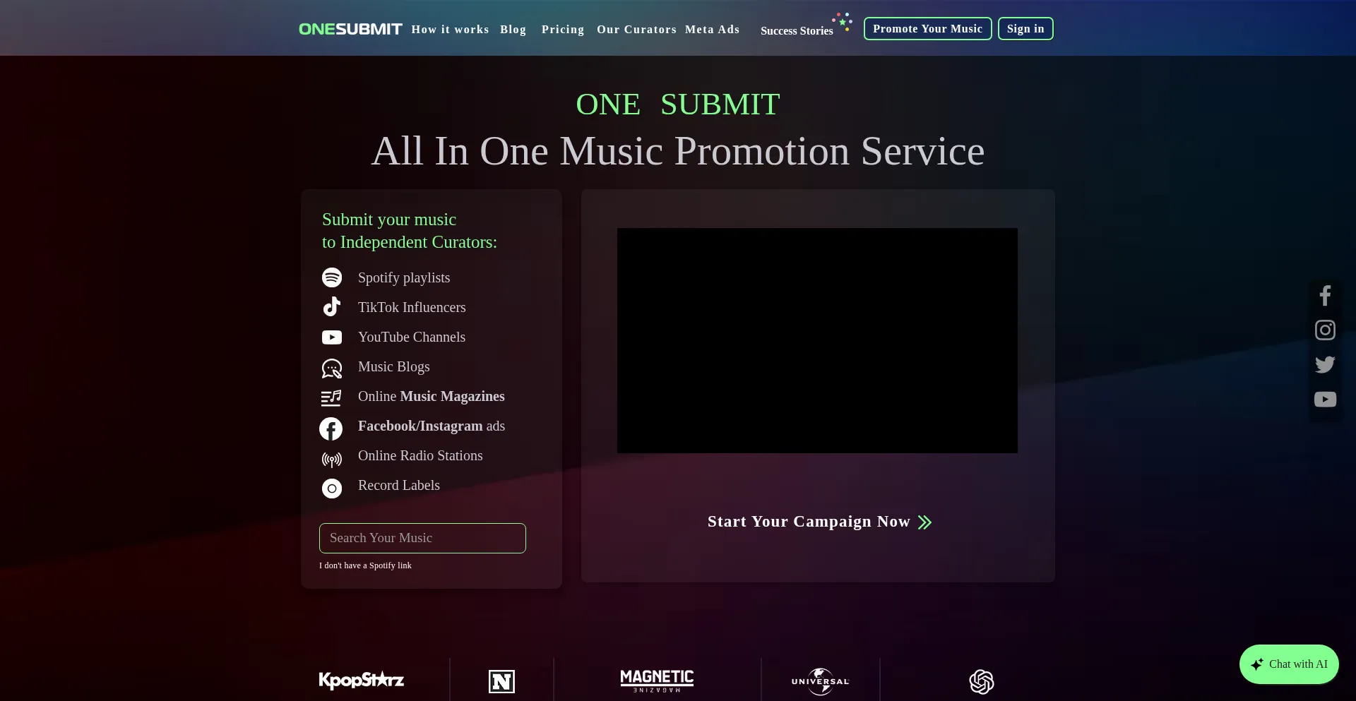 One Submit is an all-in-One music promotion service. We help independent artists promote music to Spotify playlists, TikTok influencers, music blogs, YouTube channels, magazines...