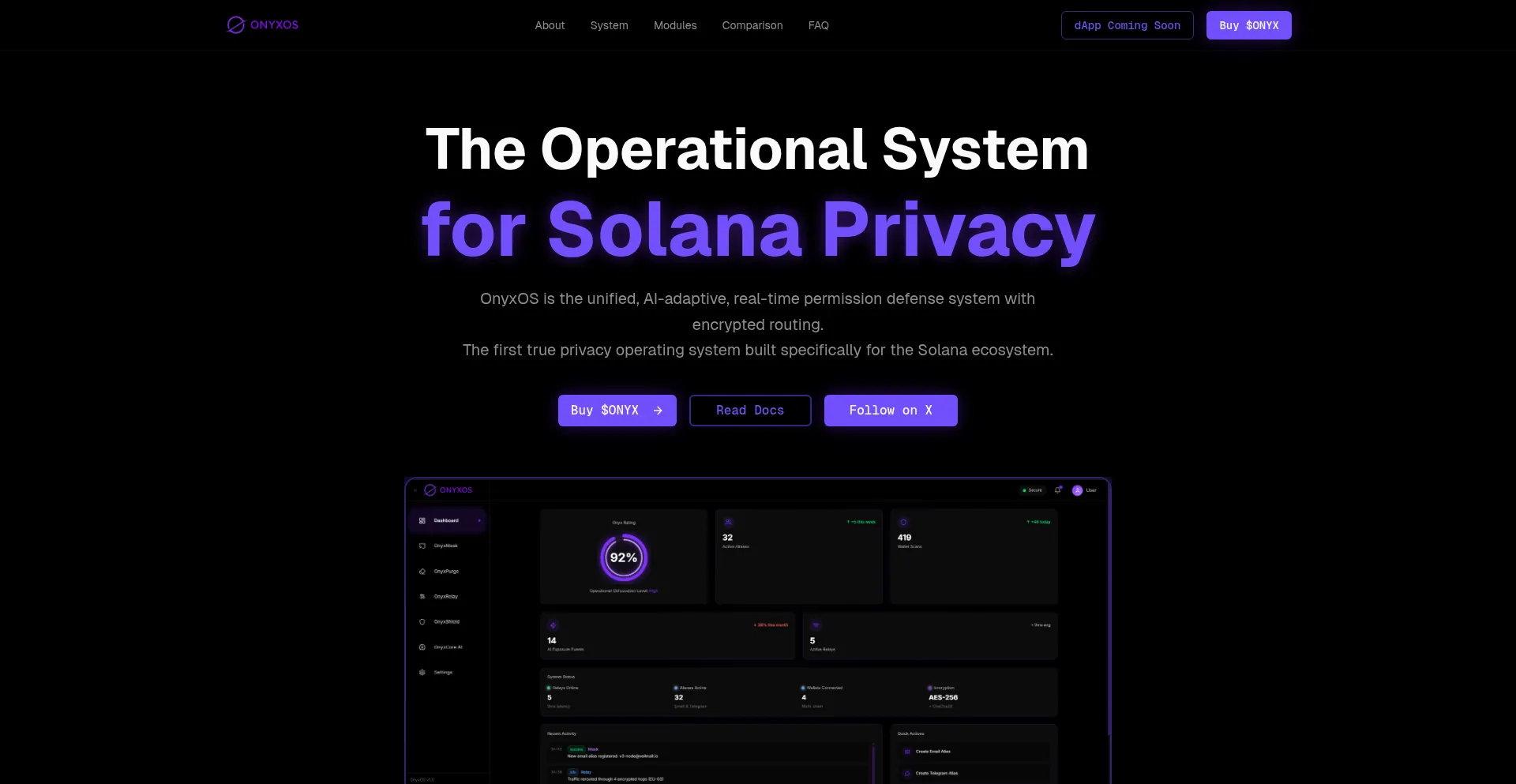 The first unified operational privacy layer for Solana. Protect your identity, permissions, and transactions with OnyxOS.
