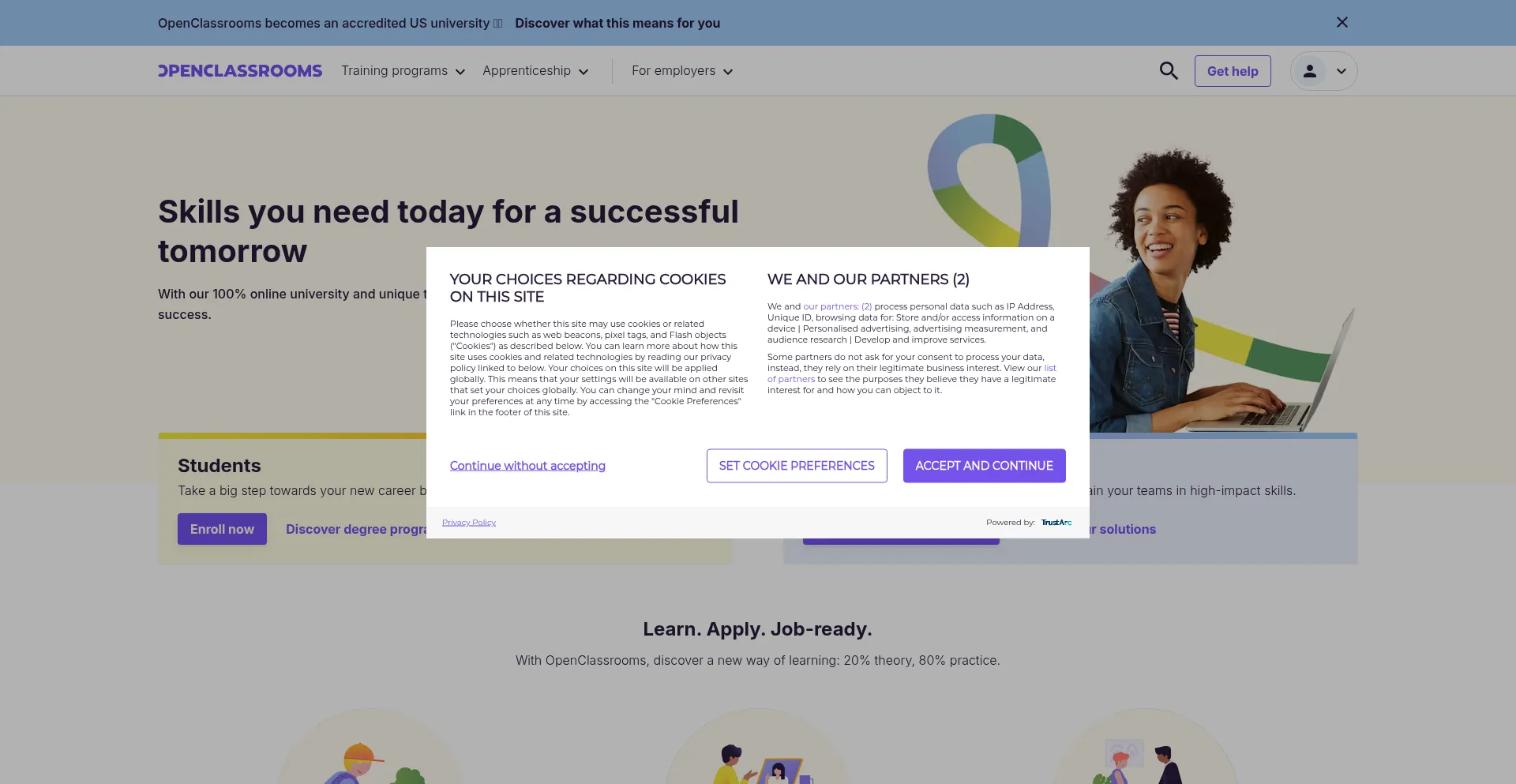 该网站显示来自认可机构的安全认证或信任印章,表明符合安全标准、数据保护协议或行业法规。来自 openclassrooms.com 的信任印章表明遵守已建立的安全实践和运营透明度。