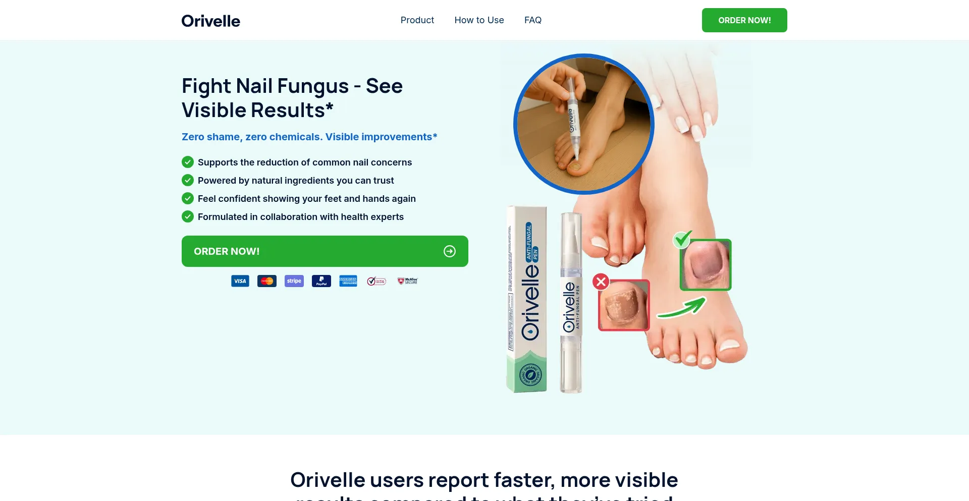 Zero shame. Zero chemicals. Orivelle is a natural method to help eliminate nail fungus and restore healthy-looking nails.