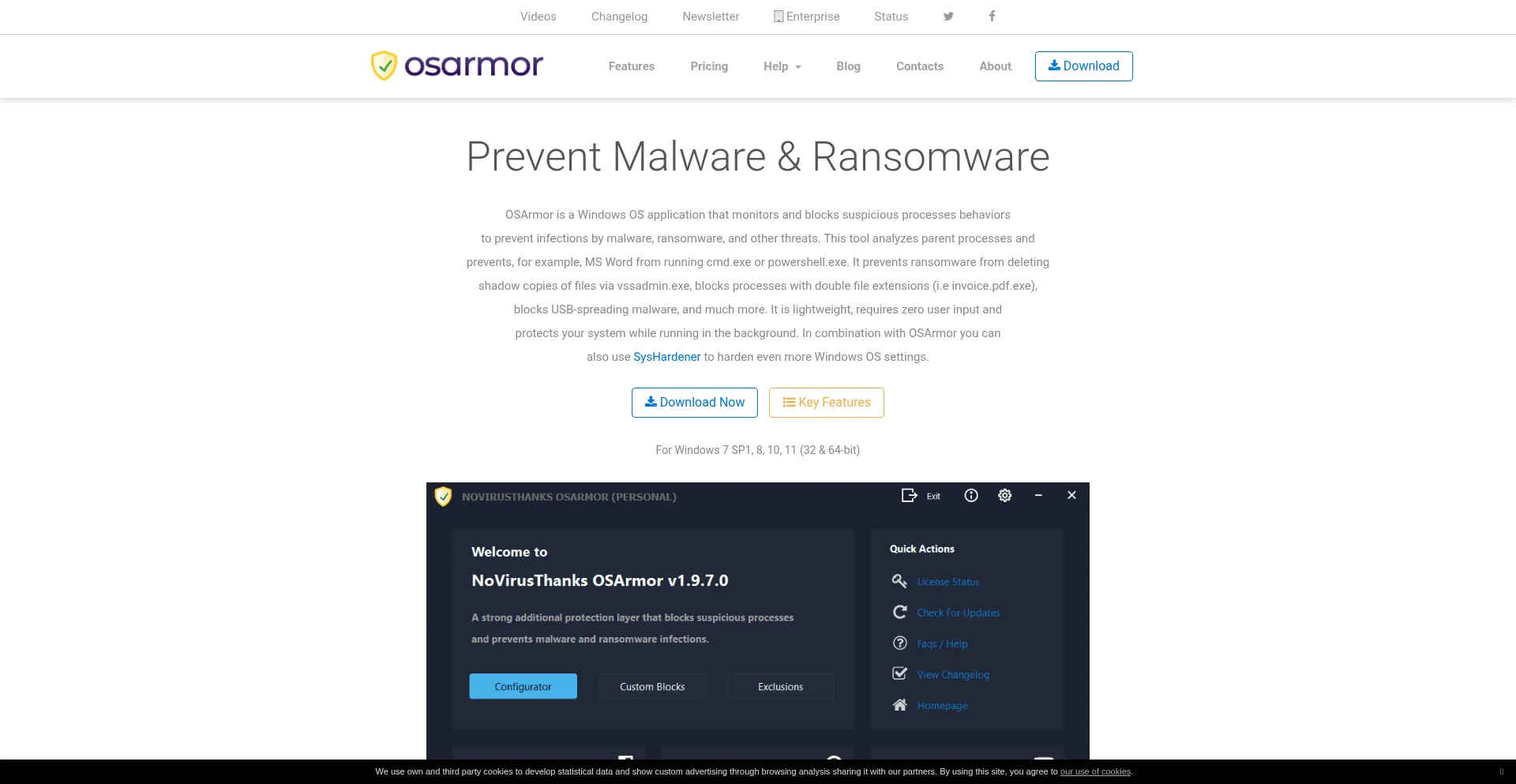 OSArmor is a Windows application that focuses on preventing malware and ransomware infections by blocking malware delivery methods and suspicious processes behaviors.