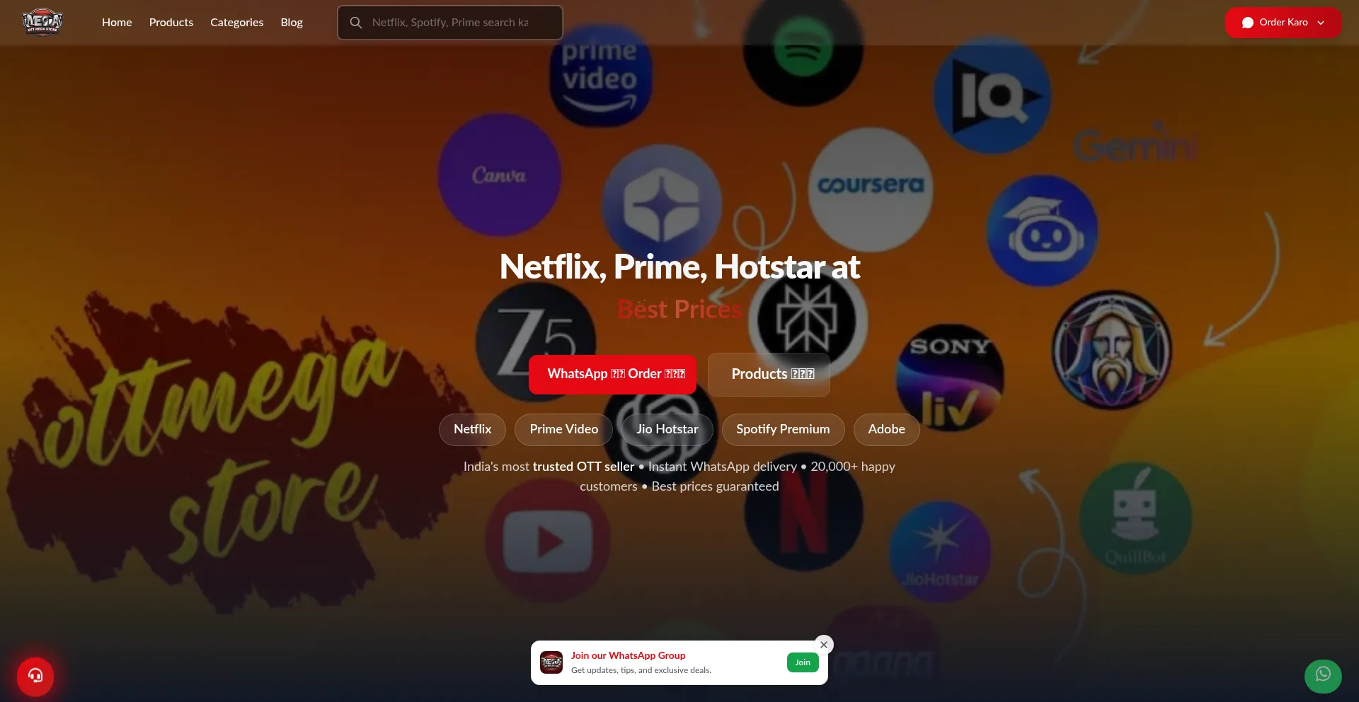 Get best & cheap OTT subscriptions at best prices in India! Netflix ₹149, Spotify ₹119, Prime Video ₹299. Order now on WhatsApp & save 50%! 20,000+ happy customers ⚡
