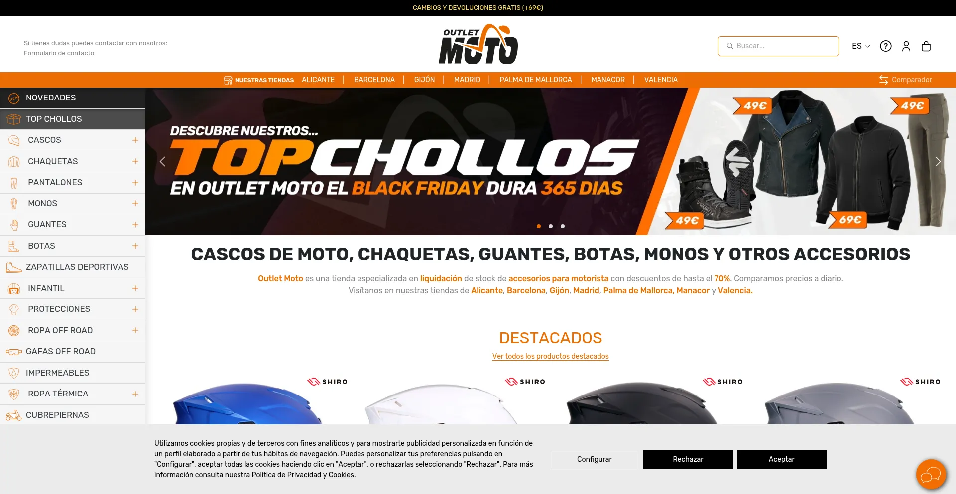 Outlet Moto, tienda de accesorios y ropa de moto con cascos, chaquetas, guantes, monos y botas a precios imbatibles. Descuentos hasta el 70%.