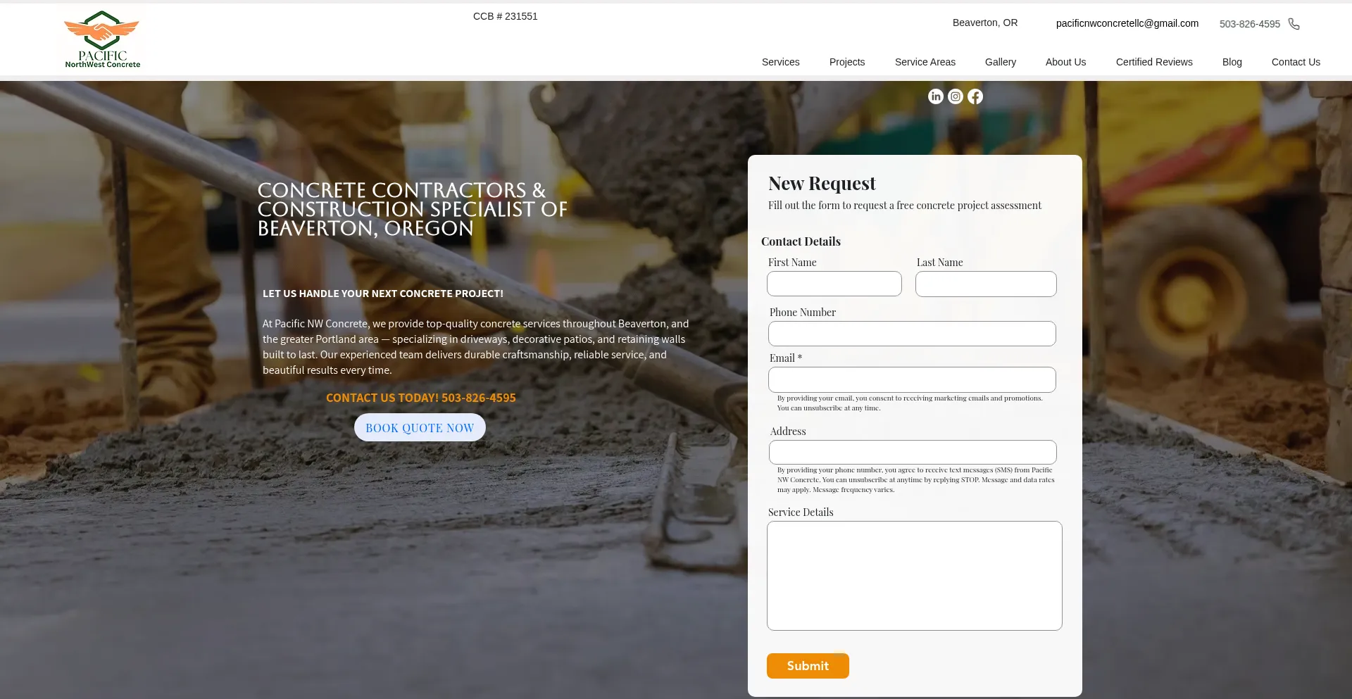 该网站实现数据收集表单,请求个人信息,包括姓名、电子邮件地址、电话号码或其他敏感详细信息。用户应验证 pacificnwconcretellc.com 的合法性并在提交个人数据前查看隐私政策。
