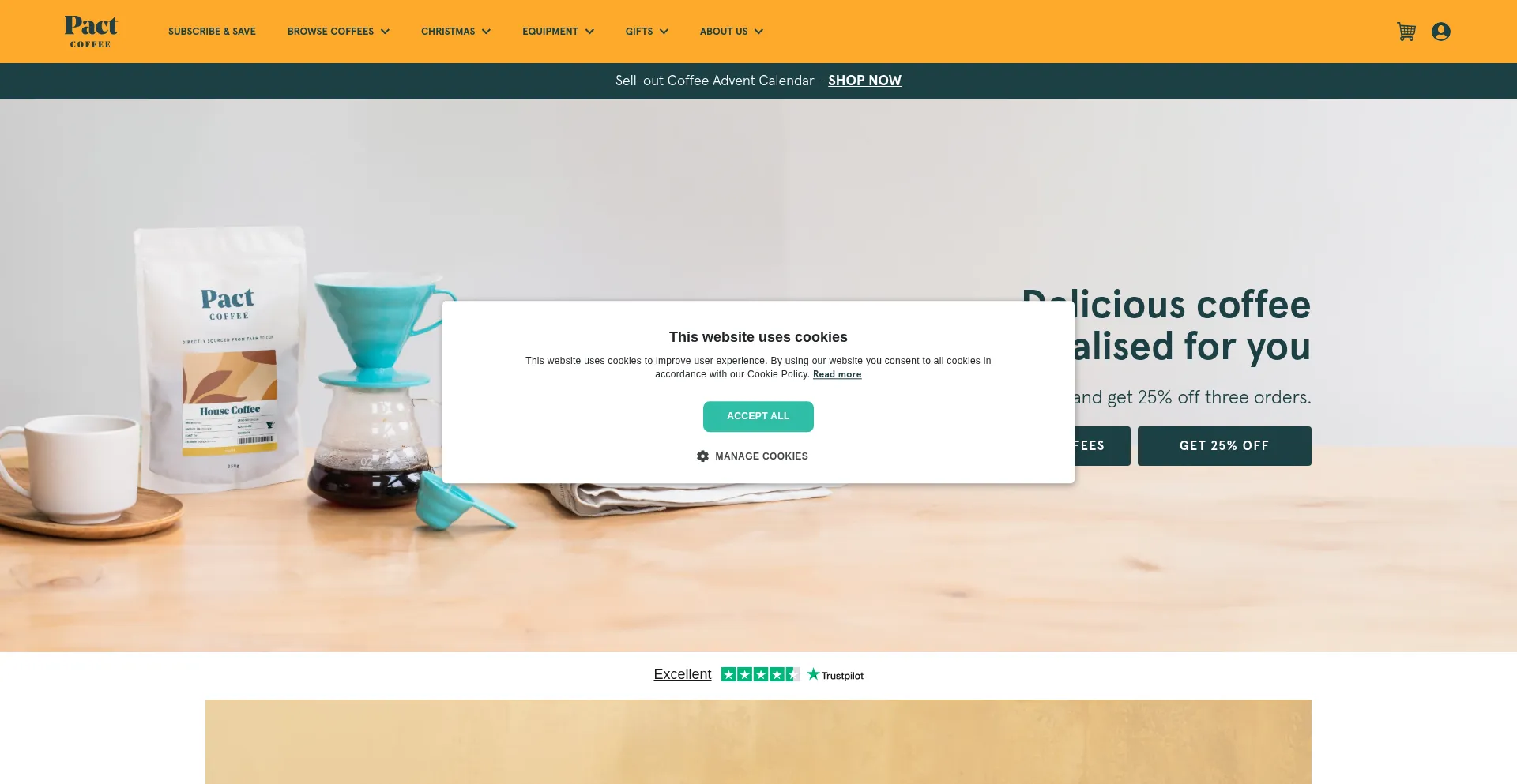 该网站实现符合GDPR或CCPA等隐私法规的cookie同意机制。这表明 pactcoffee.com 遵守数据保护标准并为用户提供对个人数据收集实践的控制。