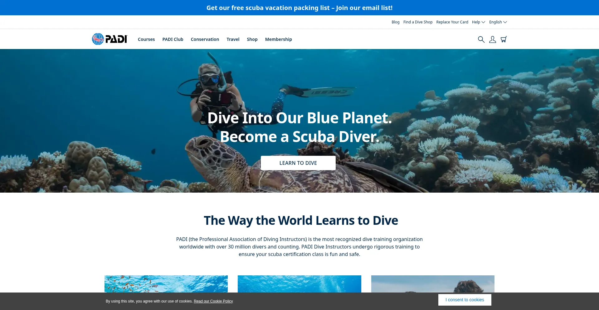 该网站显示来自认可机构的安全认证或信任印章,表明符合安全标准、数据保护协议或行业法规。来自 padi.com 的信任印章表明遵守已建立的安全实践和运营透明度。
