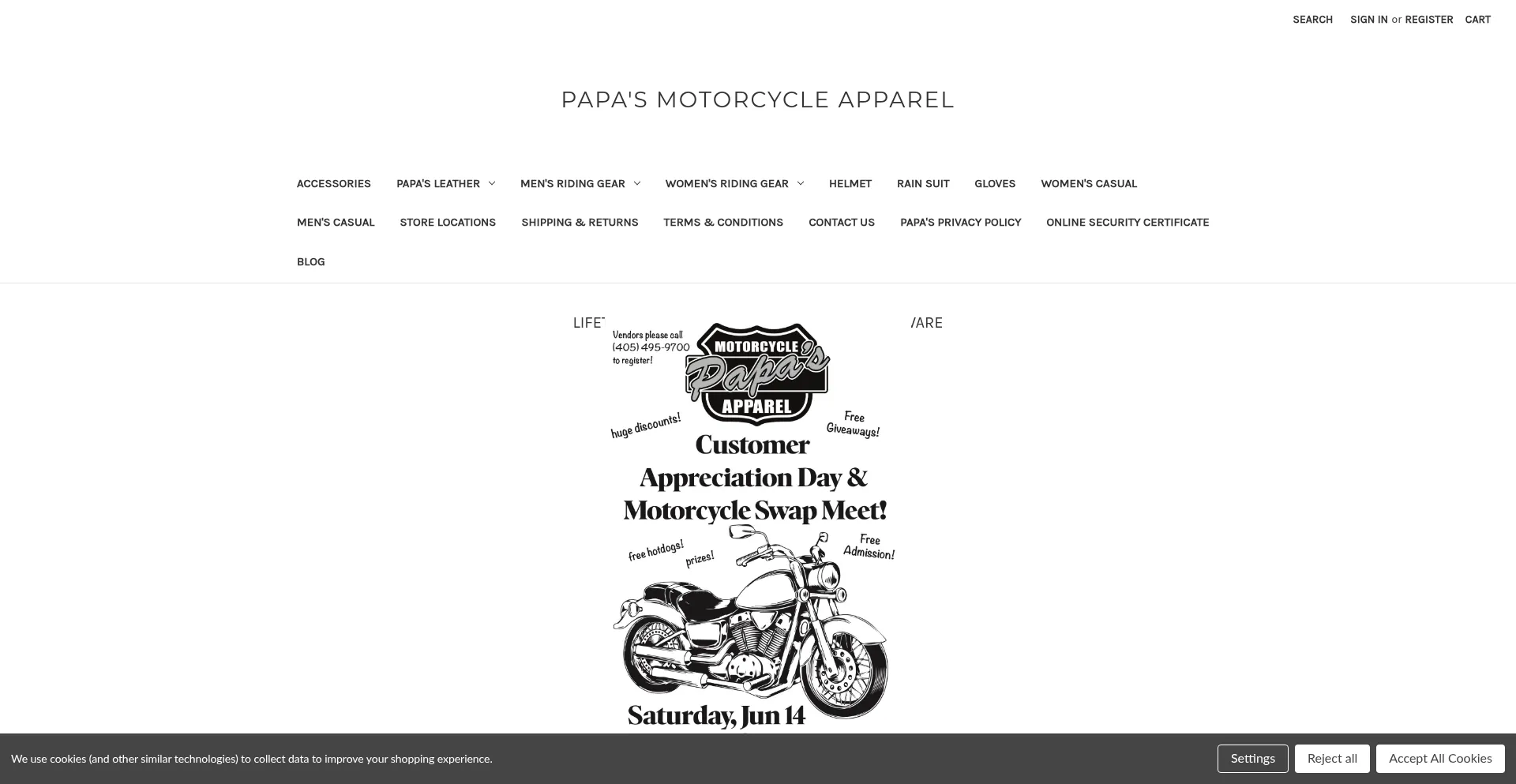 该网站实现符合GDPR或CCPA等隐私法规的cookie同意机制。这表明 papasleather.com 遵守数据保护标准并为用户提供对个人数据收集实践的控制。