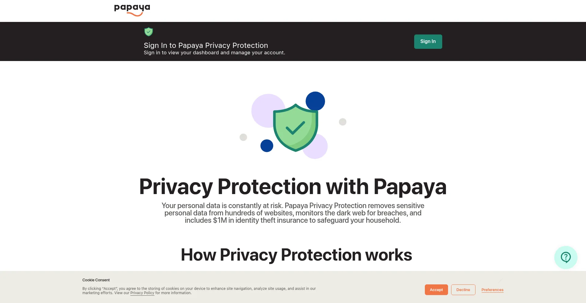 该网站实现数据收集表单,请求个人信息,包括姓名、电子邮件地址、电话号码或其他敏感详细信息。用户应验证 papayaprivacy.com 的合法性并在提交个人数据前查看隐私政策。