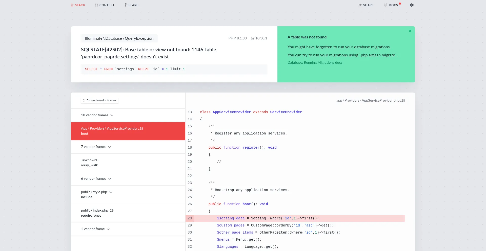 SQLSTATE[42S02]: Base table or view not found: 1146 Table 'paprdcor_paprdc.settings' doesn't exist (Connection: mysql, SQL: select * from `settings` where `id` = 1 limit 1)