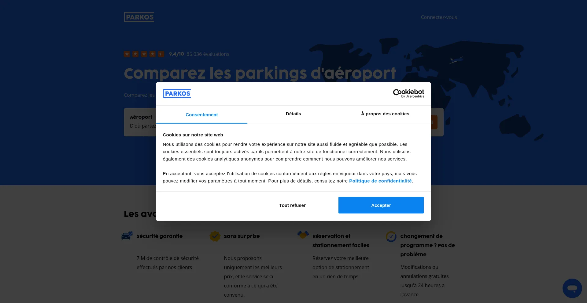 该网站实现符合GDPR或CCPA等隐私法规的cookie同意机制。这表明 parkos.fr 遵守数据保护标准并为用户提供对个人数据收集实践的控制。