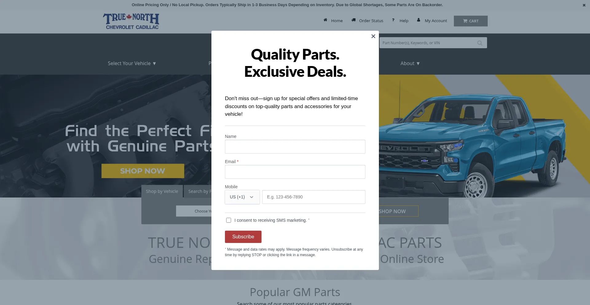 该网站实现数据收集表单,请求个人信息,包括姓名、电子邮件地址、电话号码或其他敏感详细信息。用户应验证 parts.truenorthchev.com 的合法性并在提交个人数据前查看隐私政策。