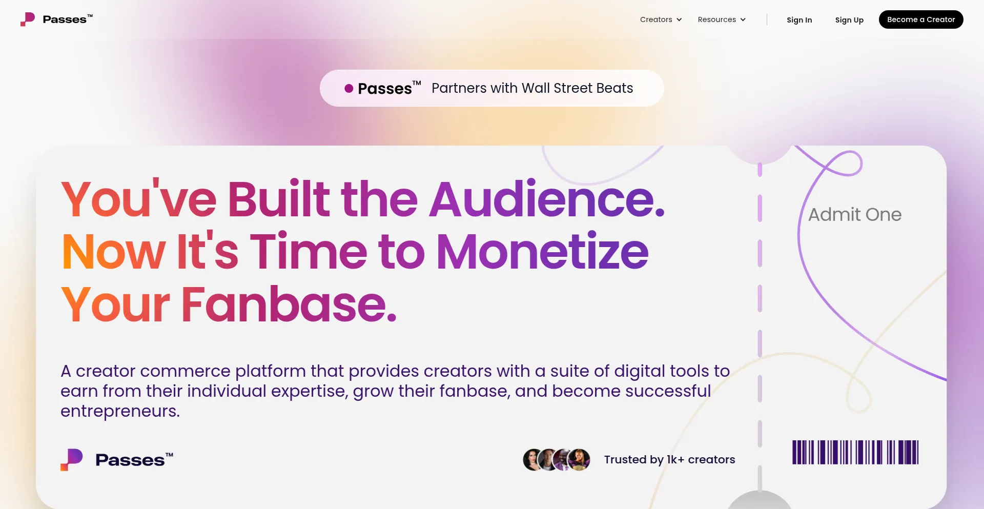 Passes provides the tools to help creators become entrepreneurs. Creators keep ~90% of their earnings and can monetize through subscription, livestream, 1-1 calls, paid dms, and...