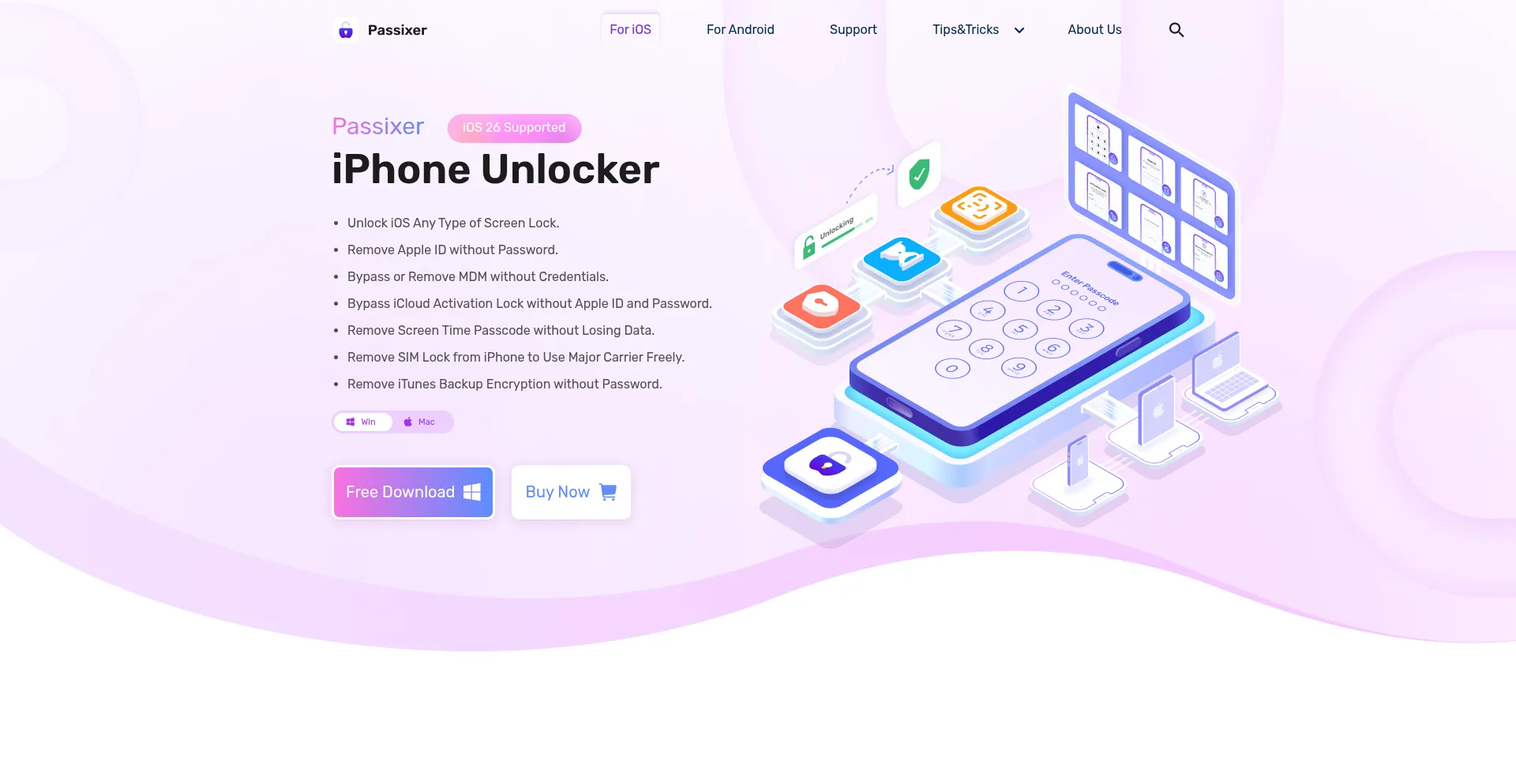 Passixer iPhone Unlocker unlocks forgotten passcodes, removes Apple ID, and bypasses MDM & iCloud Activation lock on iPhone, iPad, and iPod without password or account.