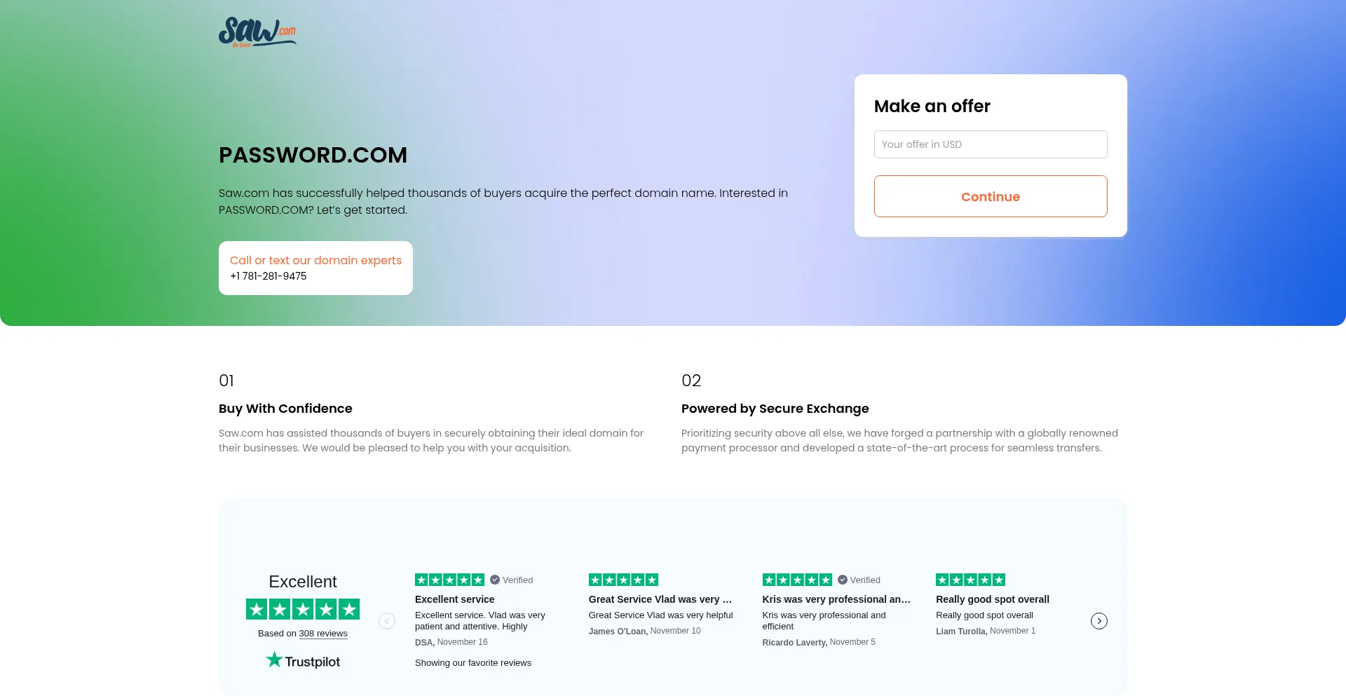 Saw.com has successfully helped thousands of buyers acquire the perfect domain name. Interested in PASSWORD.COM? Let’s get started.