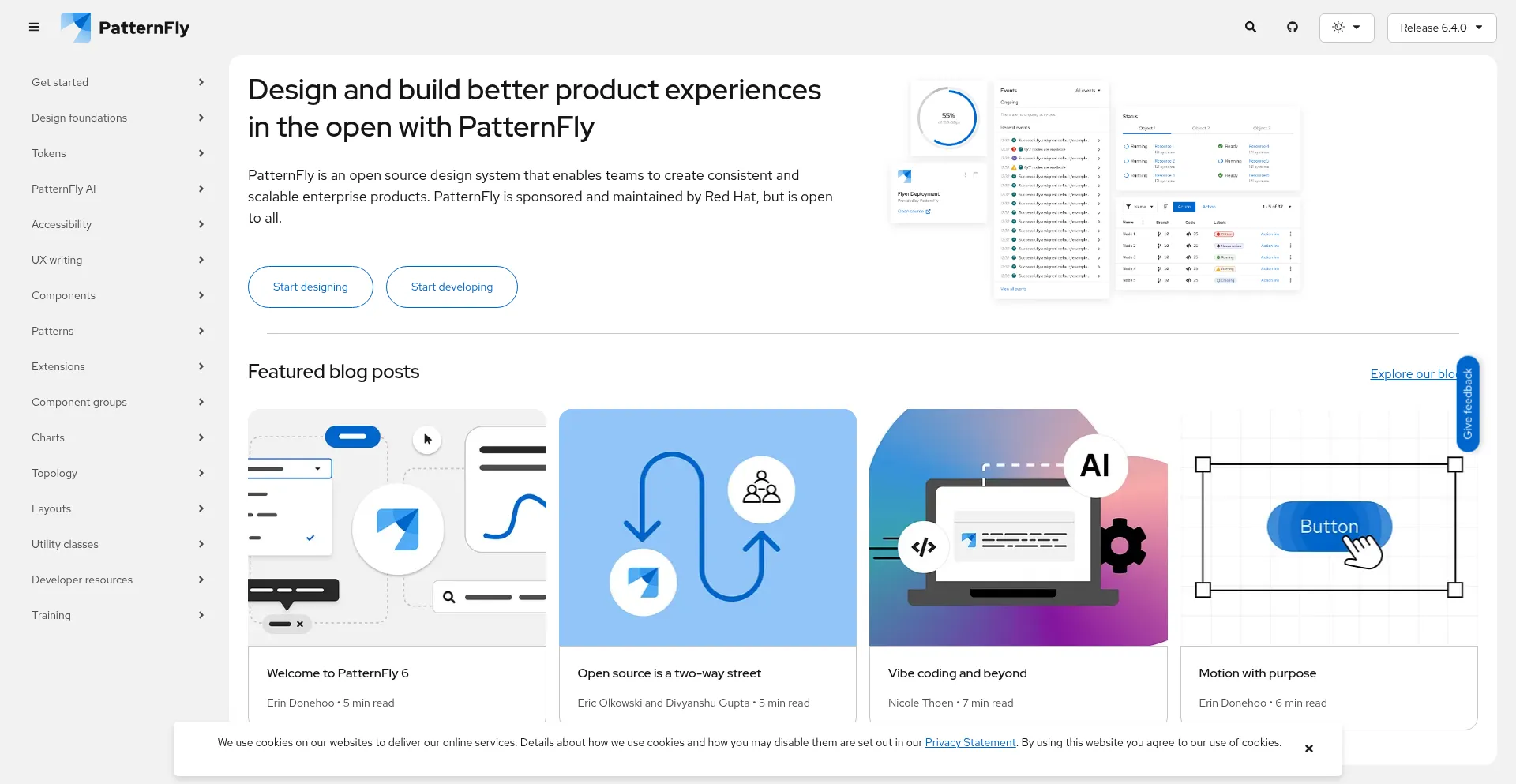 PatternFly is Red Hat's open source design system. It consists of components, documentation, and code for building enterprise applications at scale.