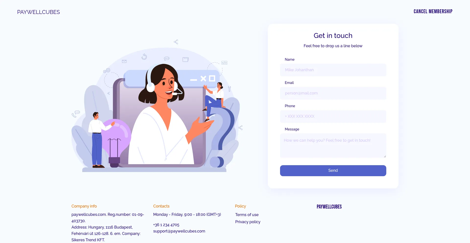该网站实现数据收集表单,请求个人信息,包括姓名、电子邮件地址、电话号码或其他敏感详细信息。用户应验证 paywellcubes.com 的合法性并在提交个人数据前查看隐私政策。