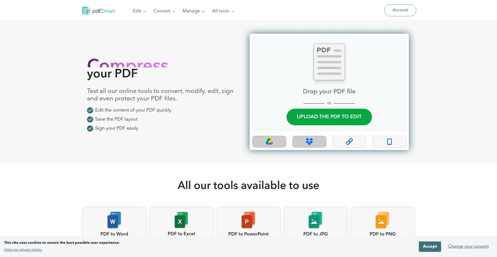 Find out about our tools for converting PDFs (to Word, PPT, JPG, etc.), modifying PDF files, signing PDFs and compressing your documents online.
