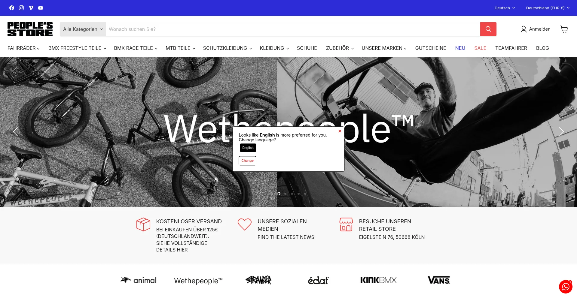 网站上存在社交媒体链接表明 peoplesstore.de 在社交媒体上维护官方账户,这是可信度和参与度的积极信号。
