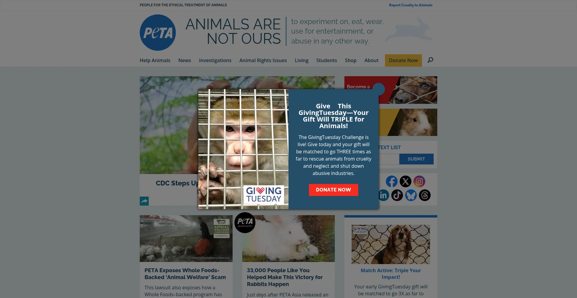 网站上存在社交媒体链接表明 peta.org 在社交媒体上维护官方账户,这是可信度和参与度的积极信号。