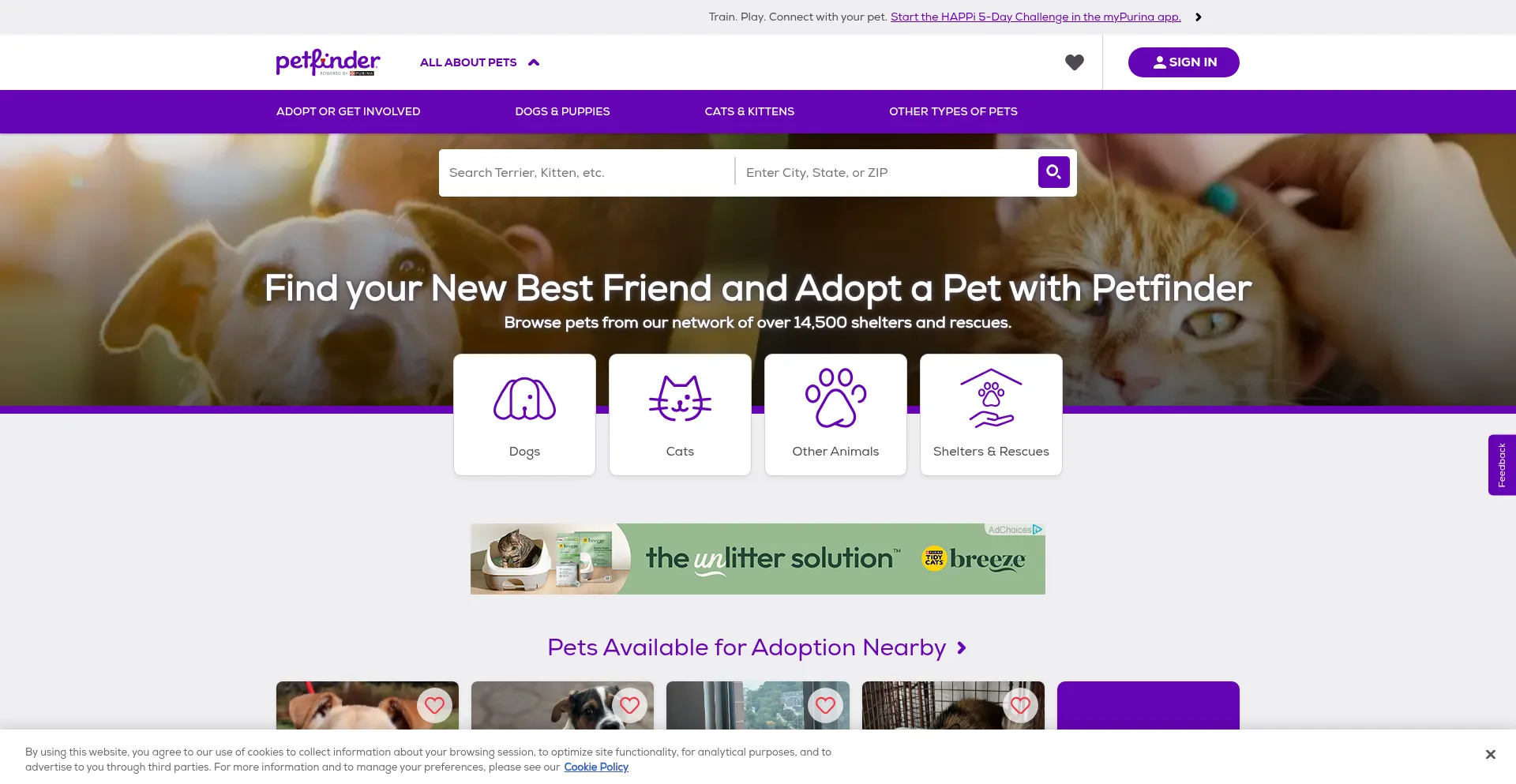 该网站实现符合GDPR或CCPA等隐私法规的cookie同意机制。这表明 petfinder.com 遵守数据保护标准并为用户提供对个人数据收集实践的控制。