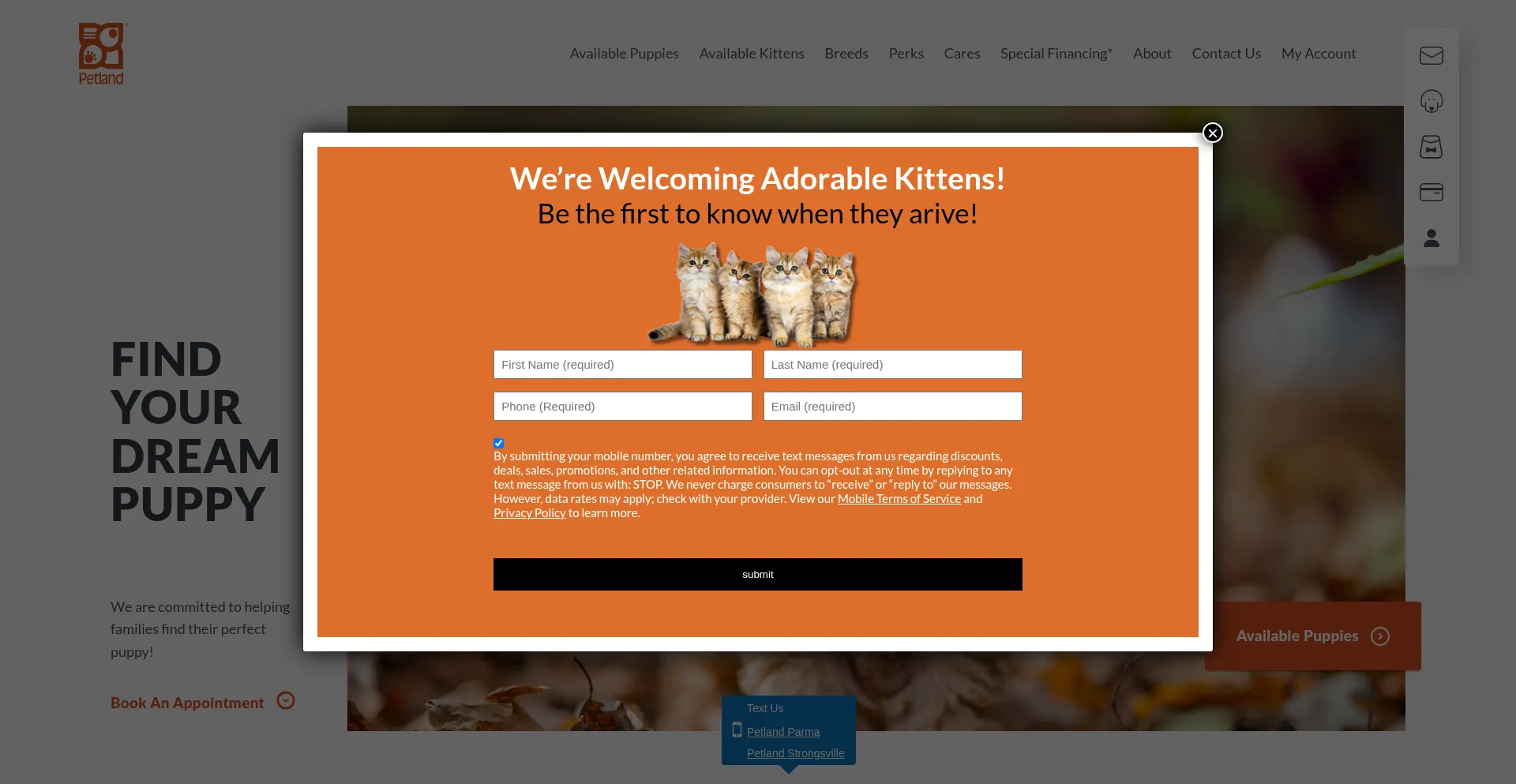 该网站实现数据收集表单,请求个人信息,包括姓名、电子邮件地址、电话号码或其他敏感详细信息。用户应验证 petlandcleveland.com 的合法性并在提交个人数据前查看隐私政策。