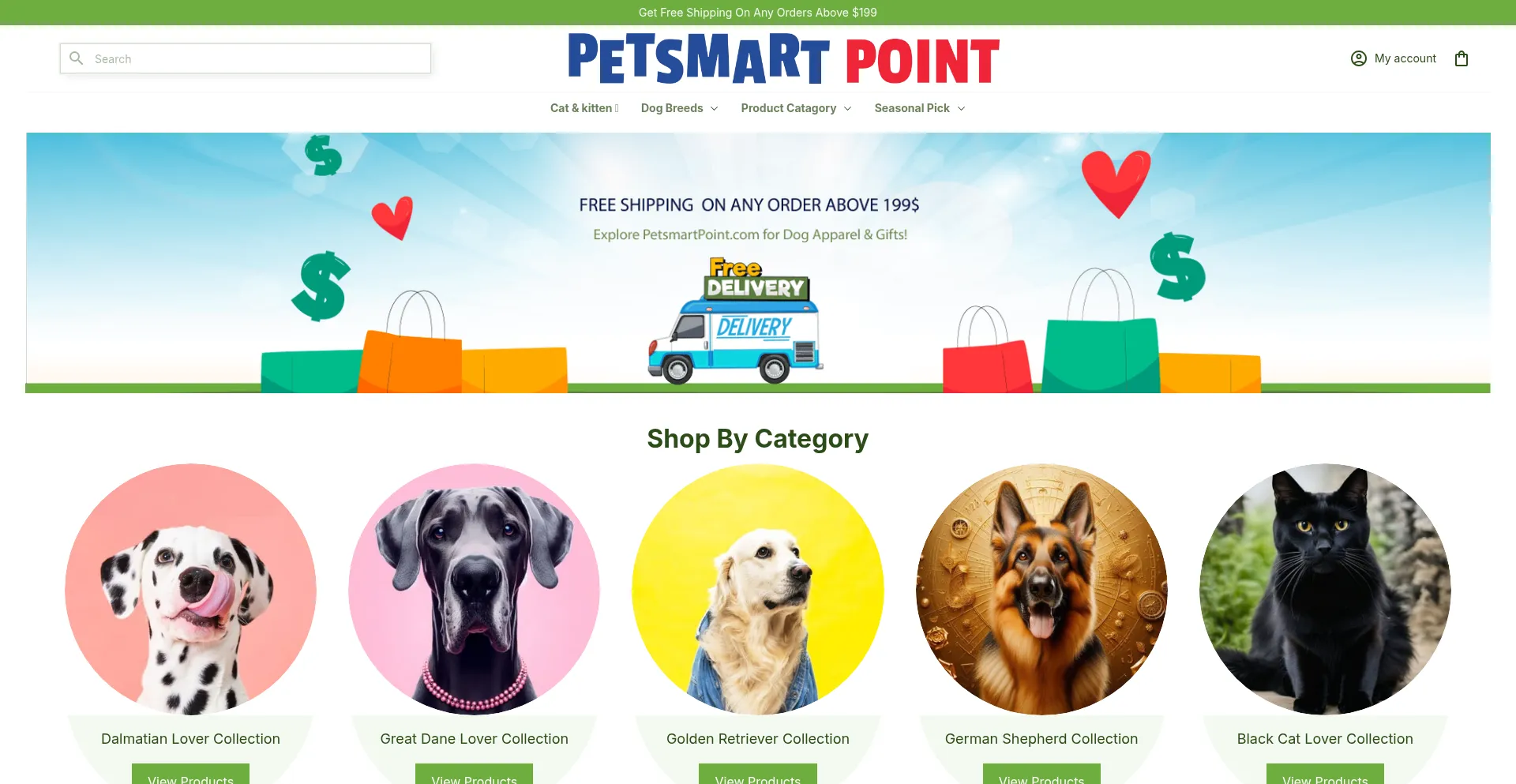 分析表明 petsmartpoint.com 作为电子商务平台运营,促进商品或服务的在线交易。该网站实现了购物车功能、支付处理系统和产品目录功能,这些是商业零售运营的典型特征。